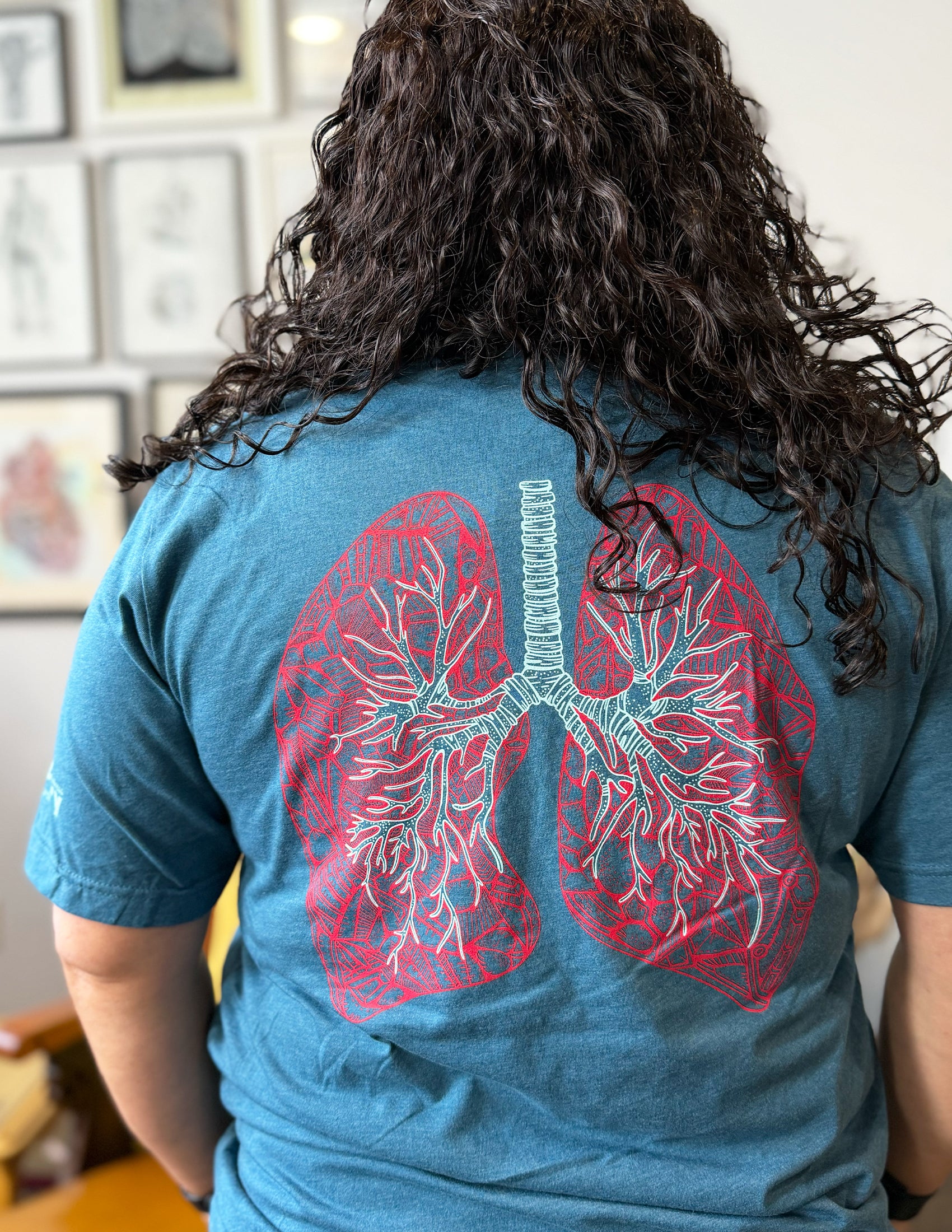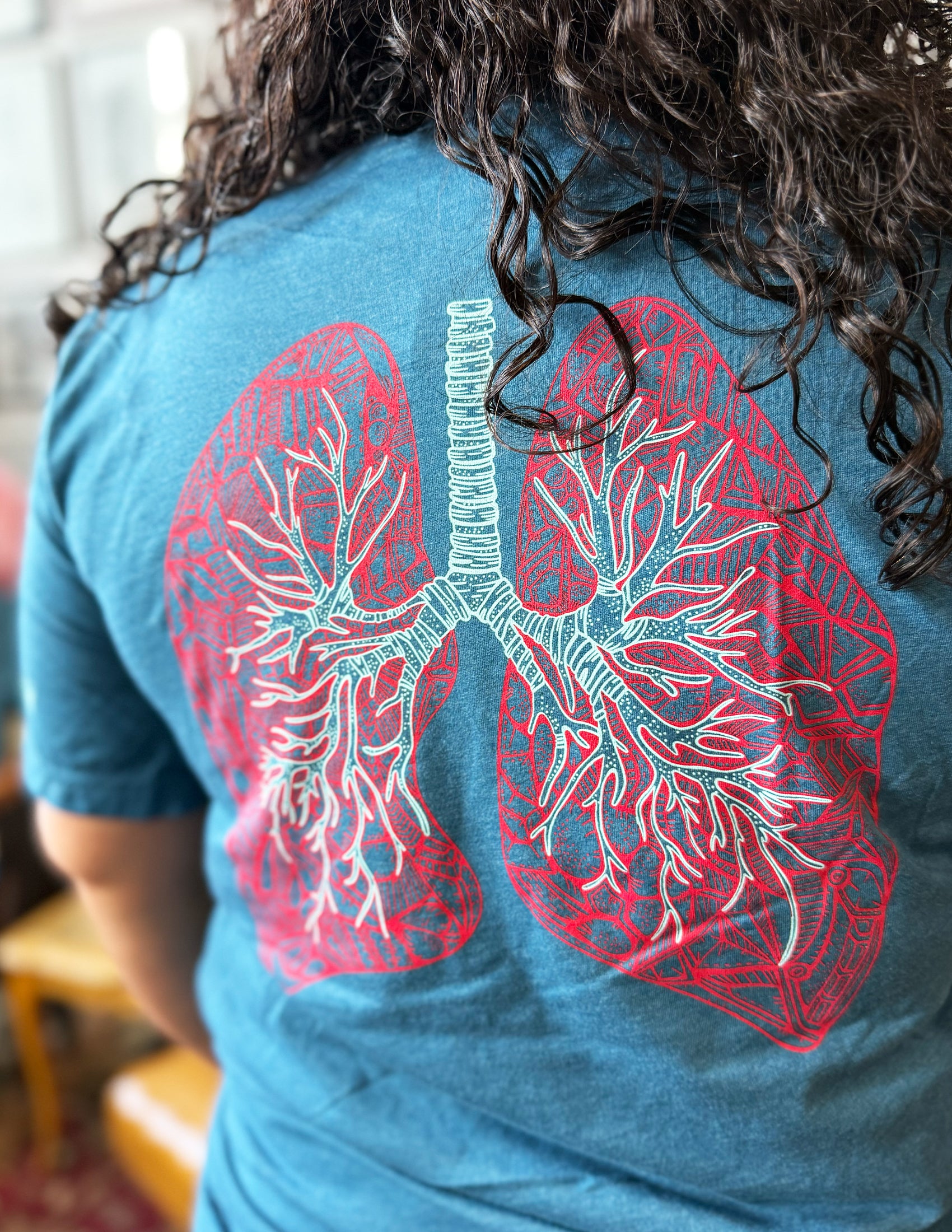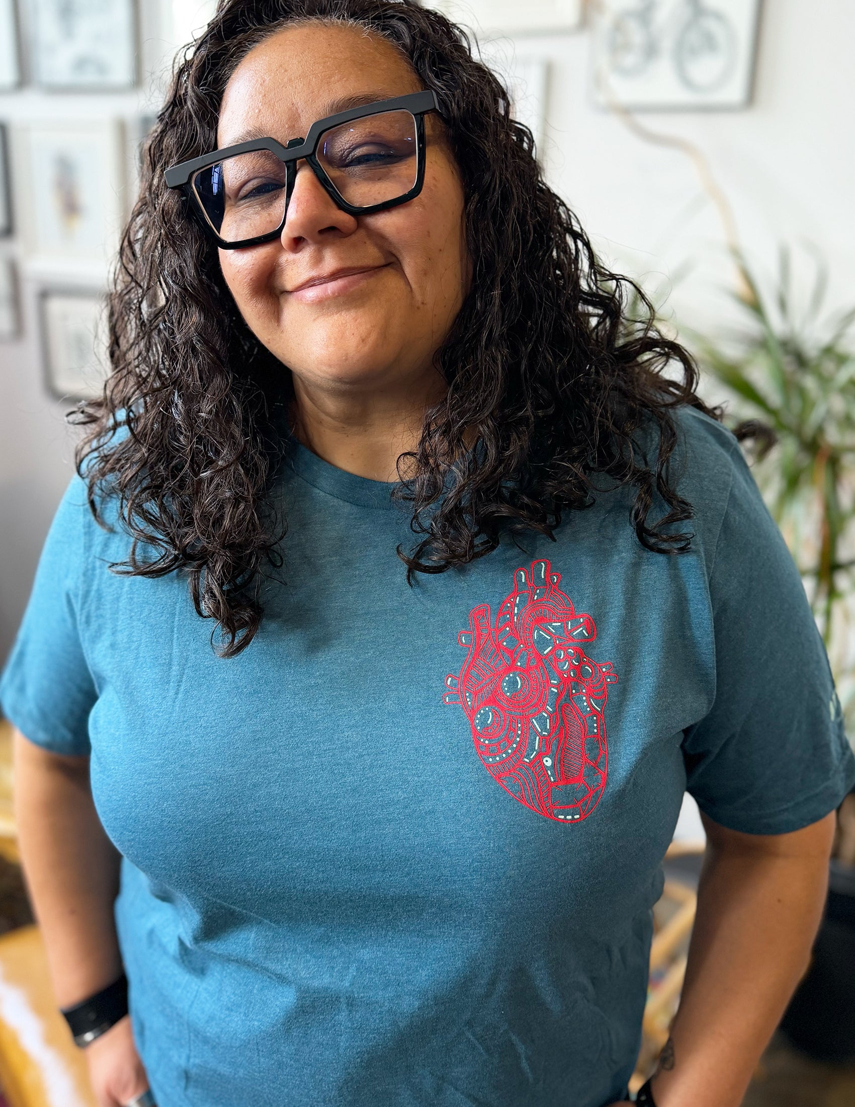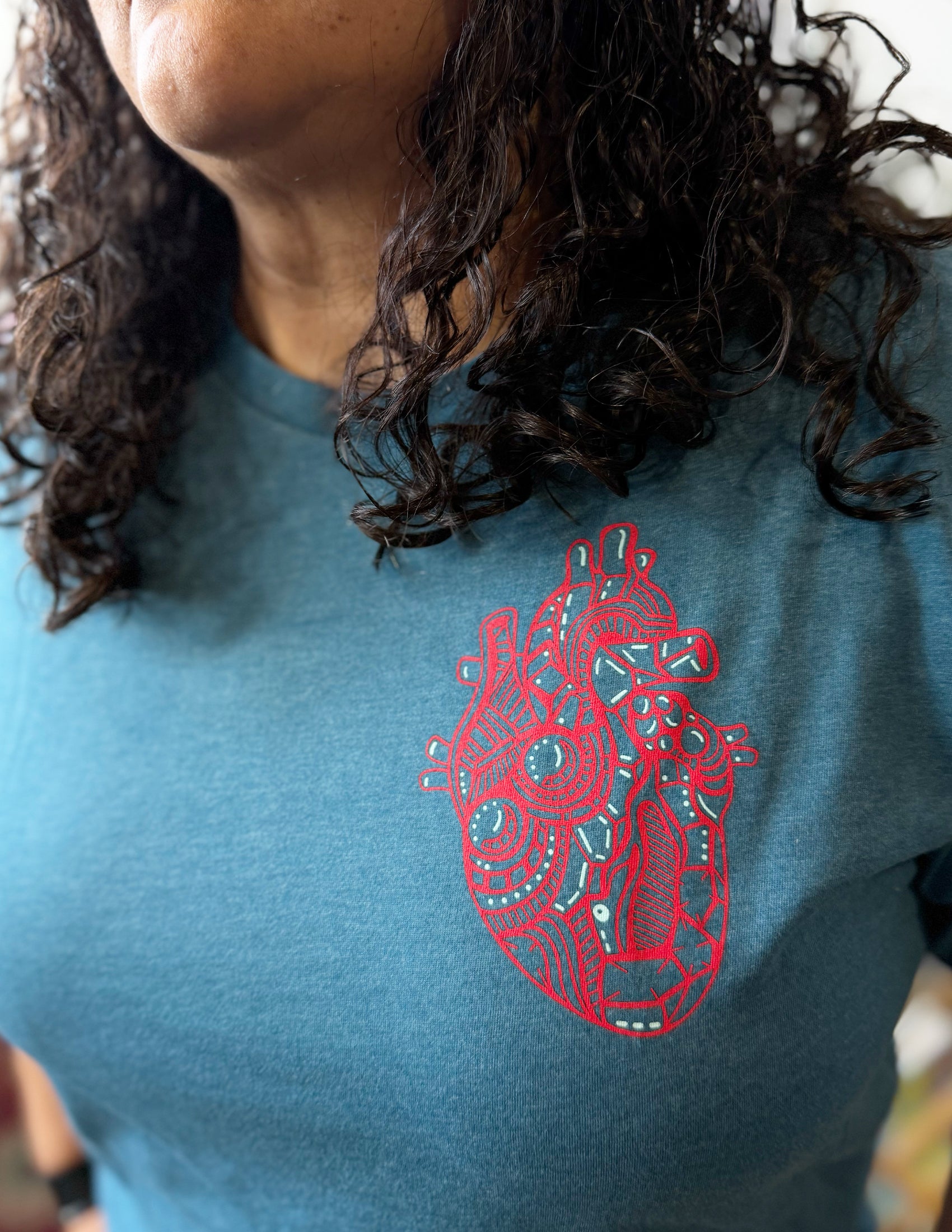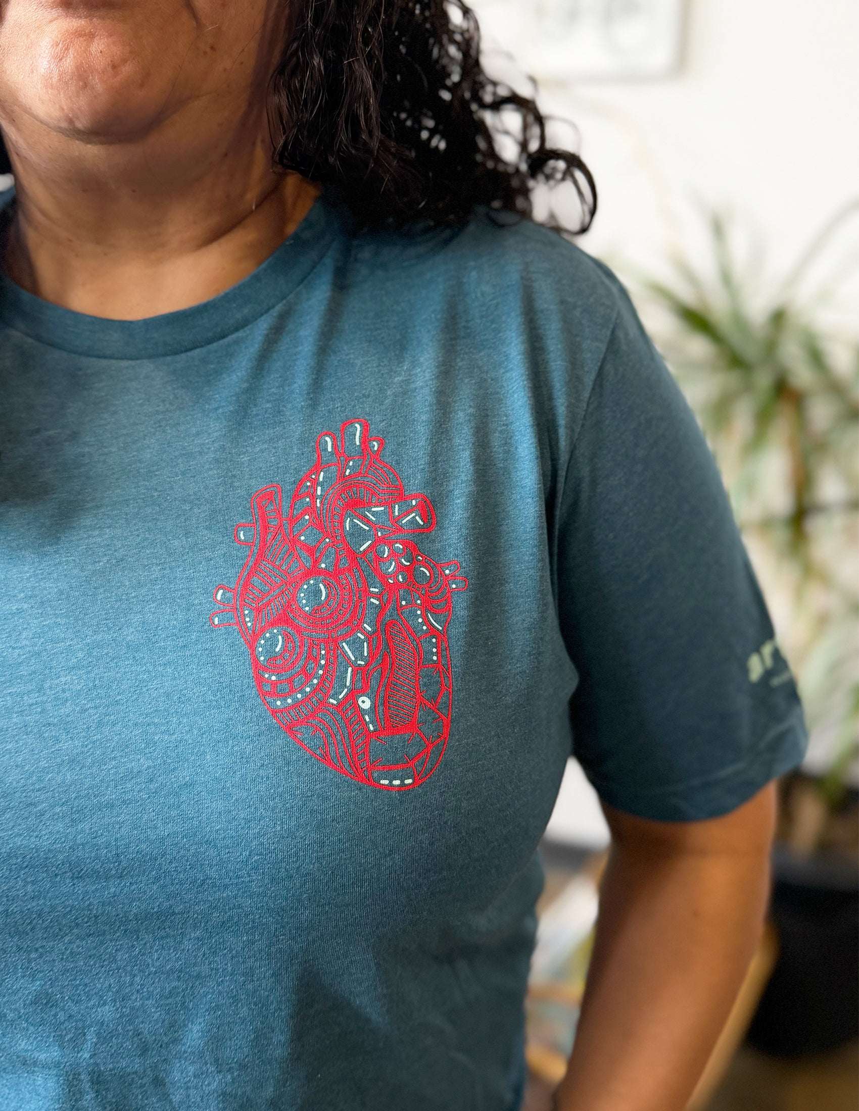 SHIRT COLOR: Dark Grey Heather OR Heather Deep Teal with Red and Light Blue ink