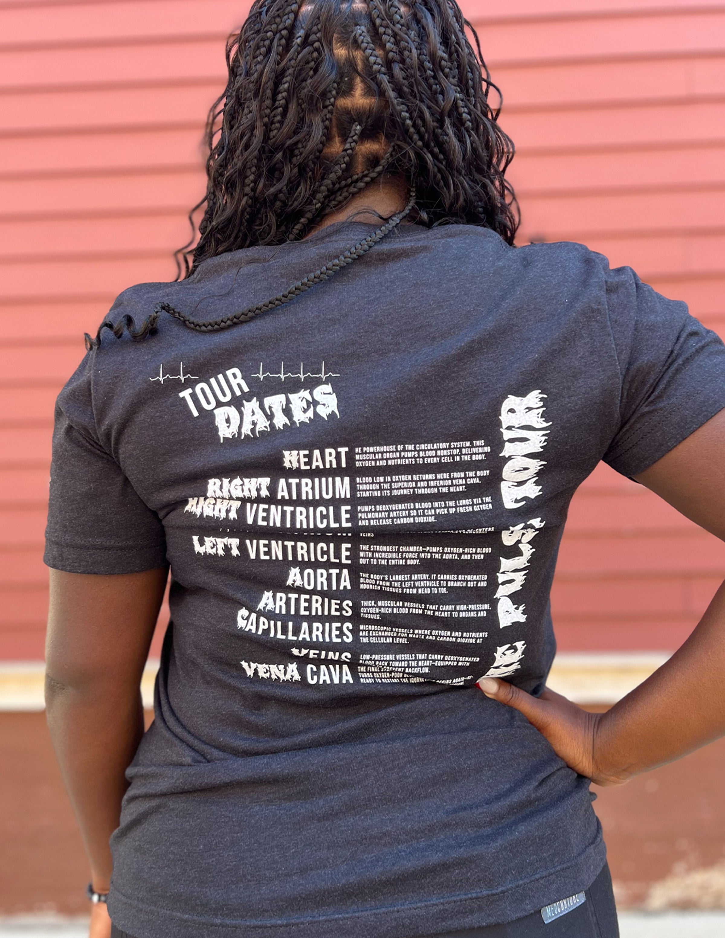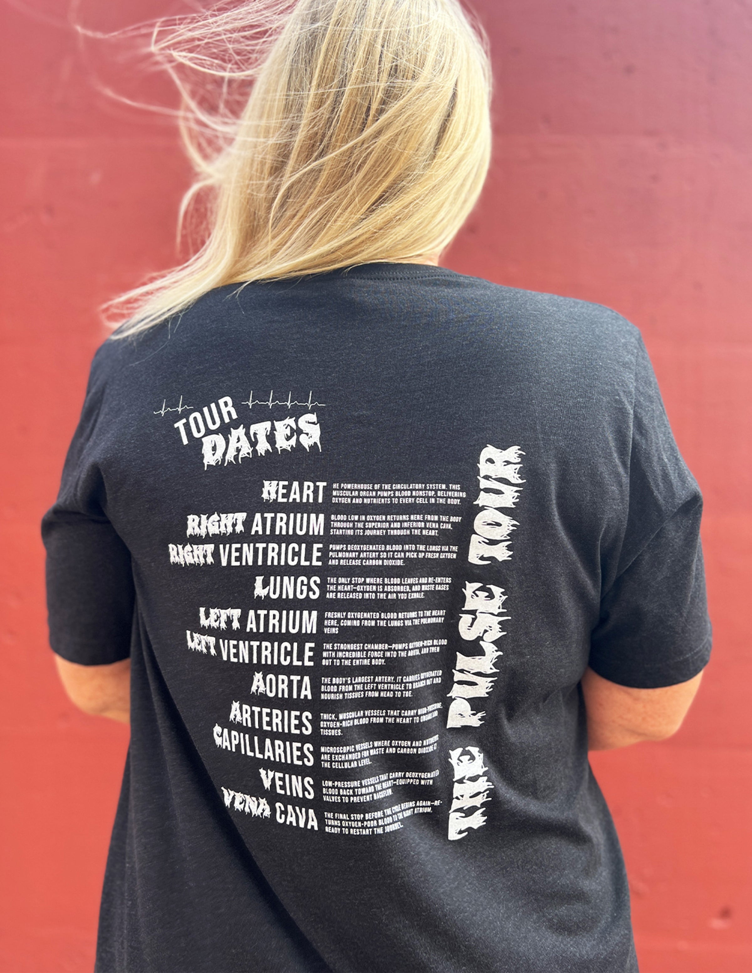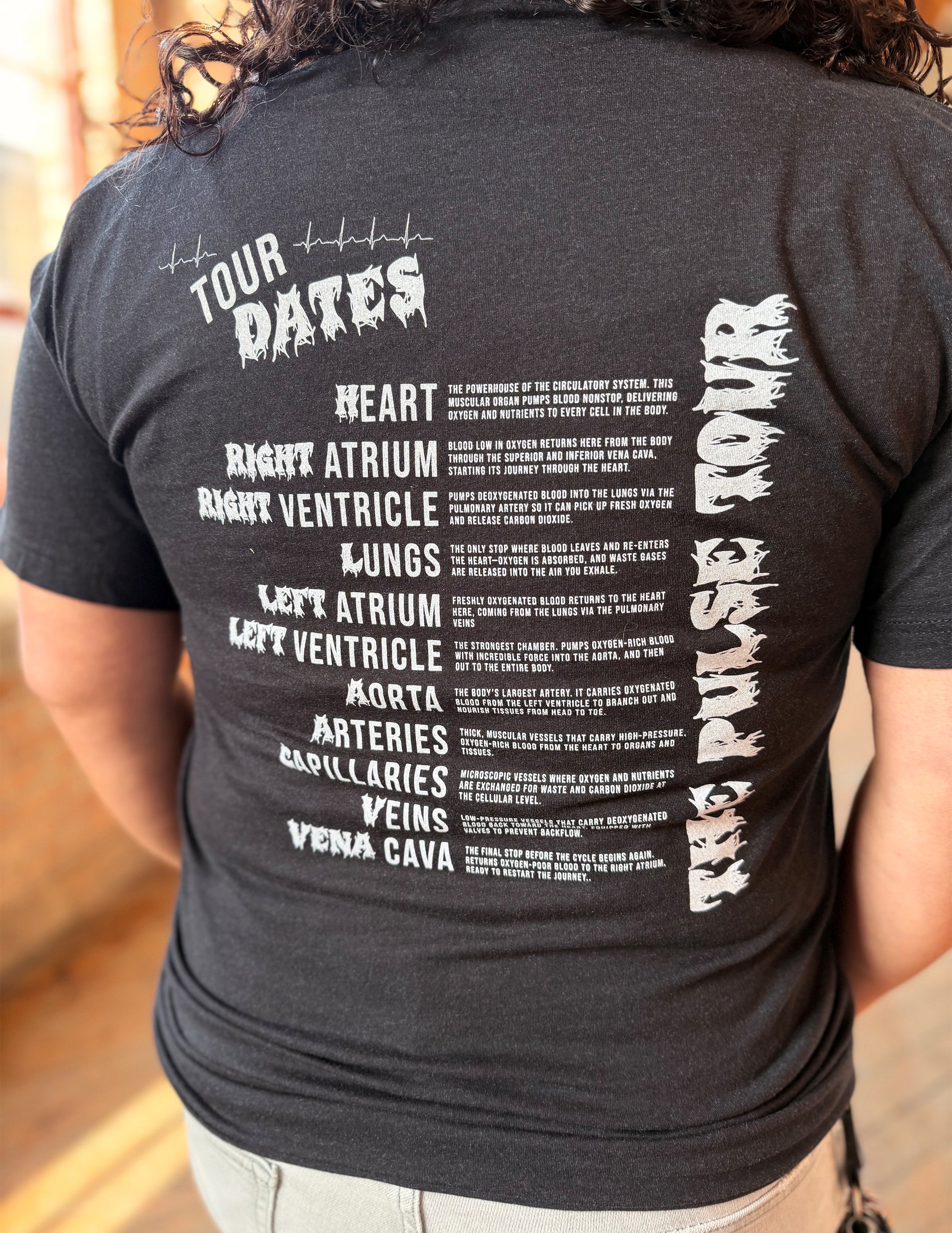 BACK: The Pulse Tour + Tour Dates (Just like tour dates on the back of a band tee - this design includes lots of fun info about the circulatory system!)