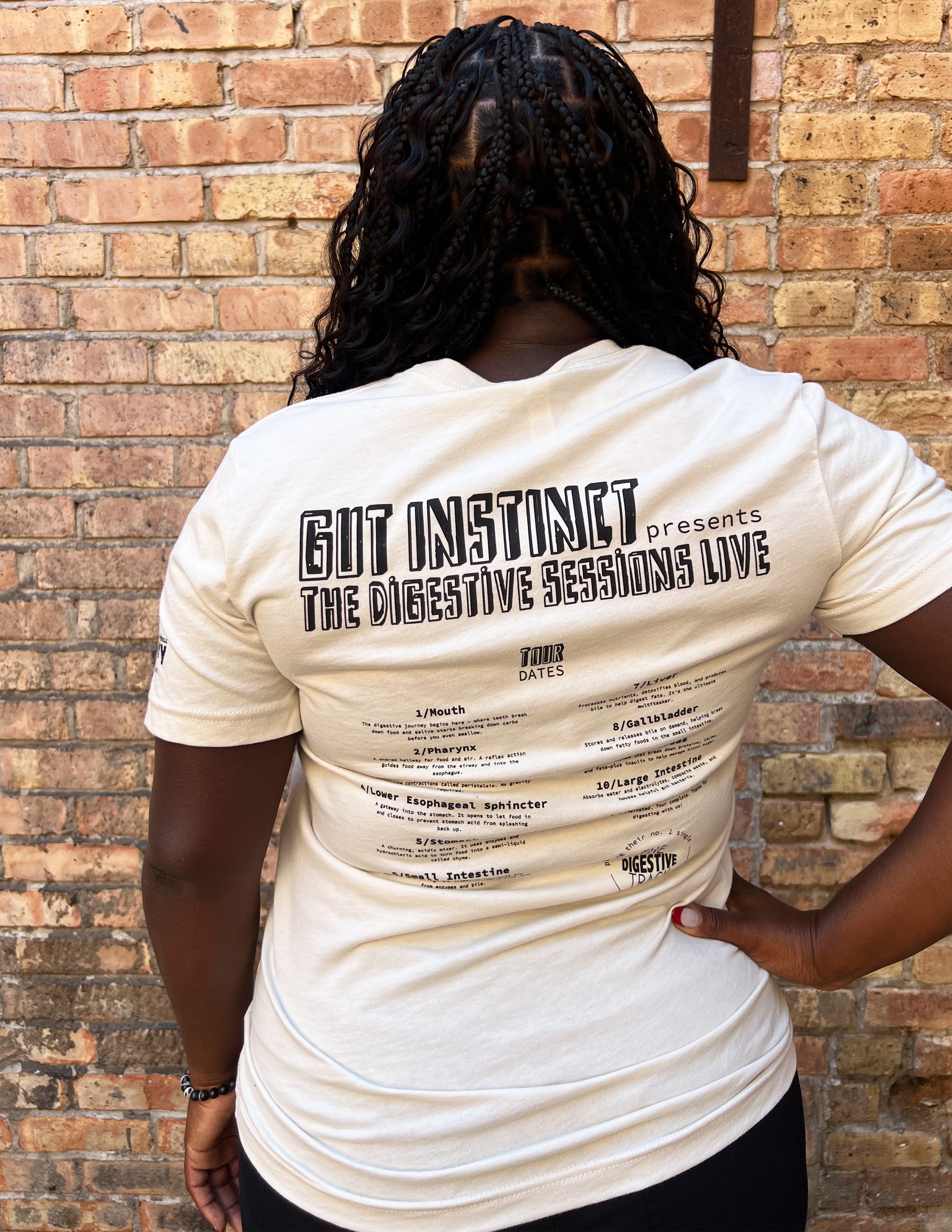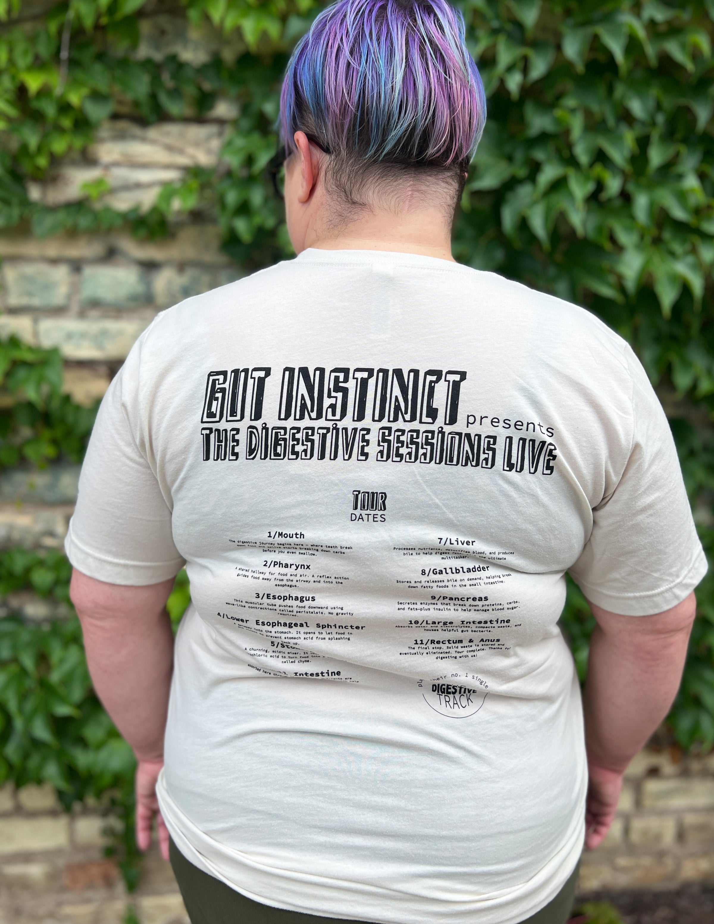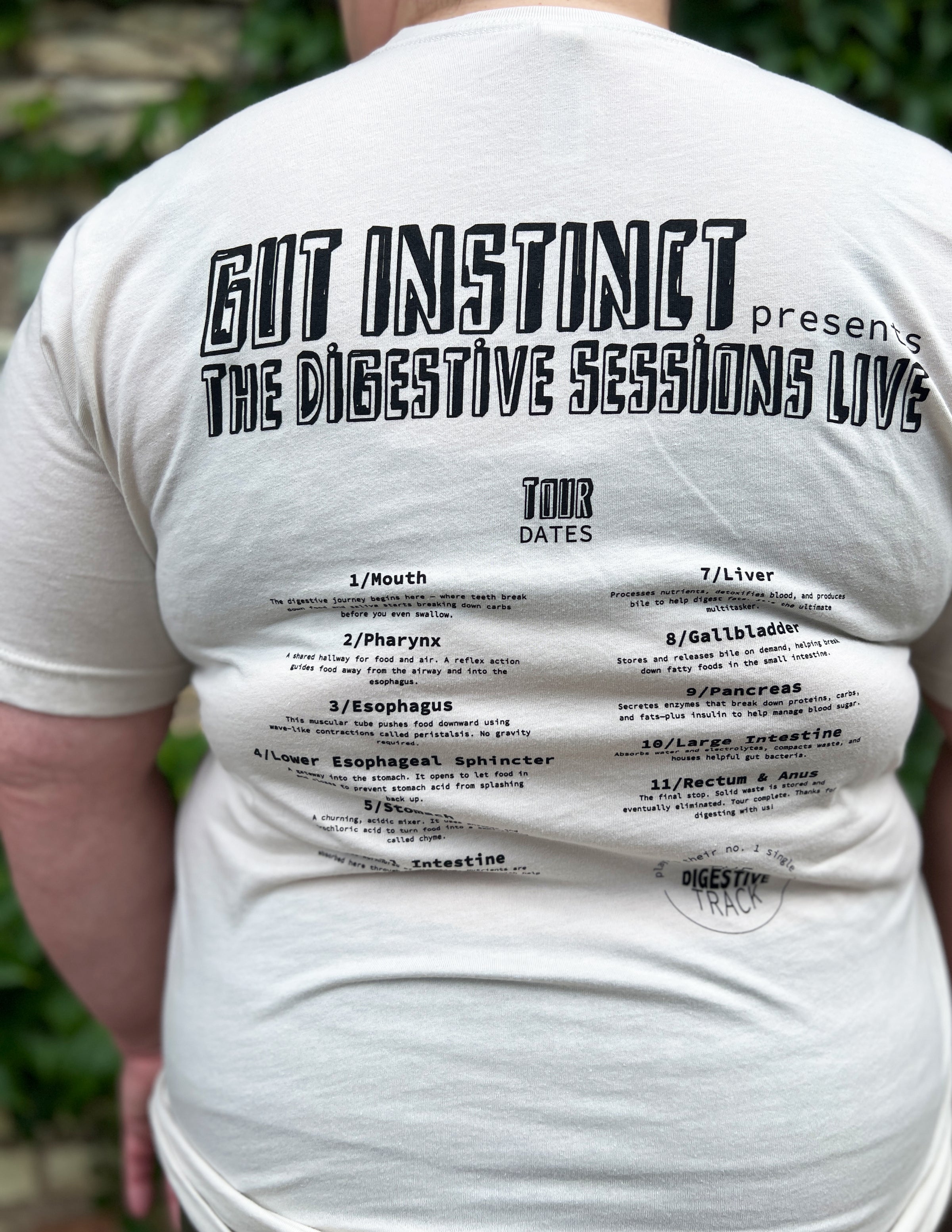 BACK: Gut Instinct Presents: The Digestive Sessions Live + Tour Dates + Playing their no.1 hit single: The Digestive Track (Just like tour dates on the back of a band tee - this design includes lots of fun info about the digestive system!)