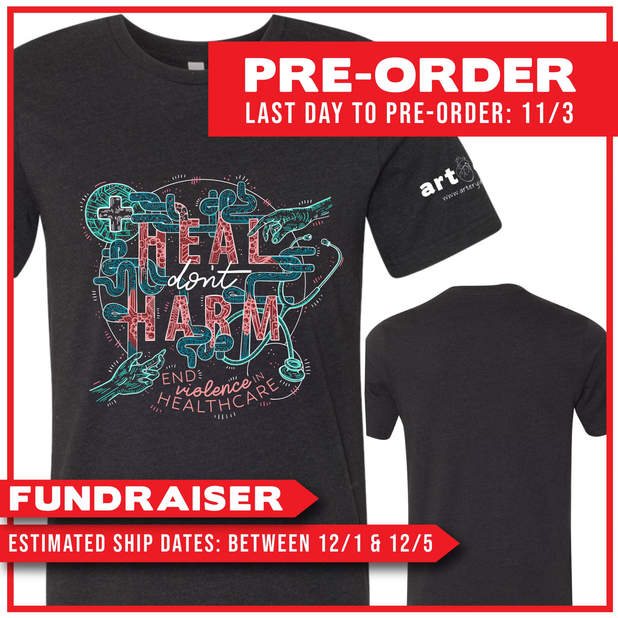 BACK: "Heal, Don't Harm - End Violence In Healthcare" Design (printed in white, red, maroon, dark blue & teal)