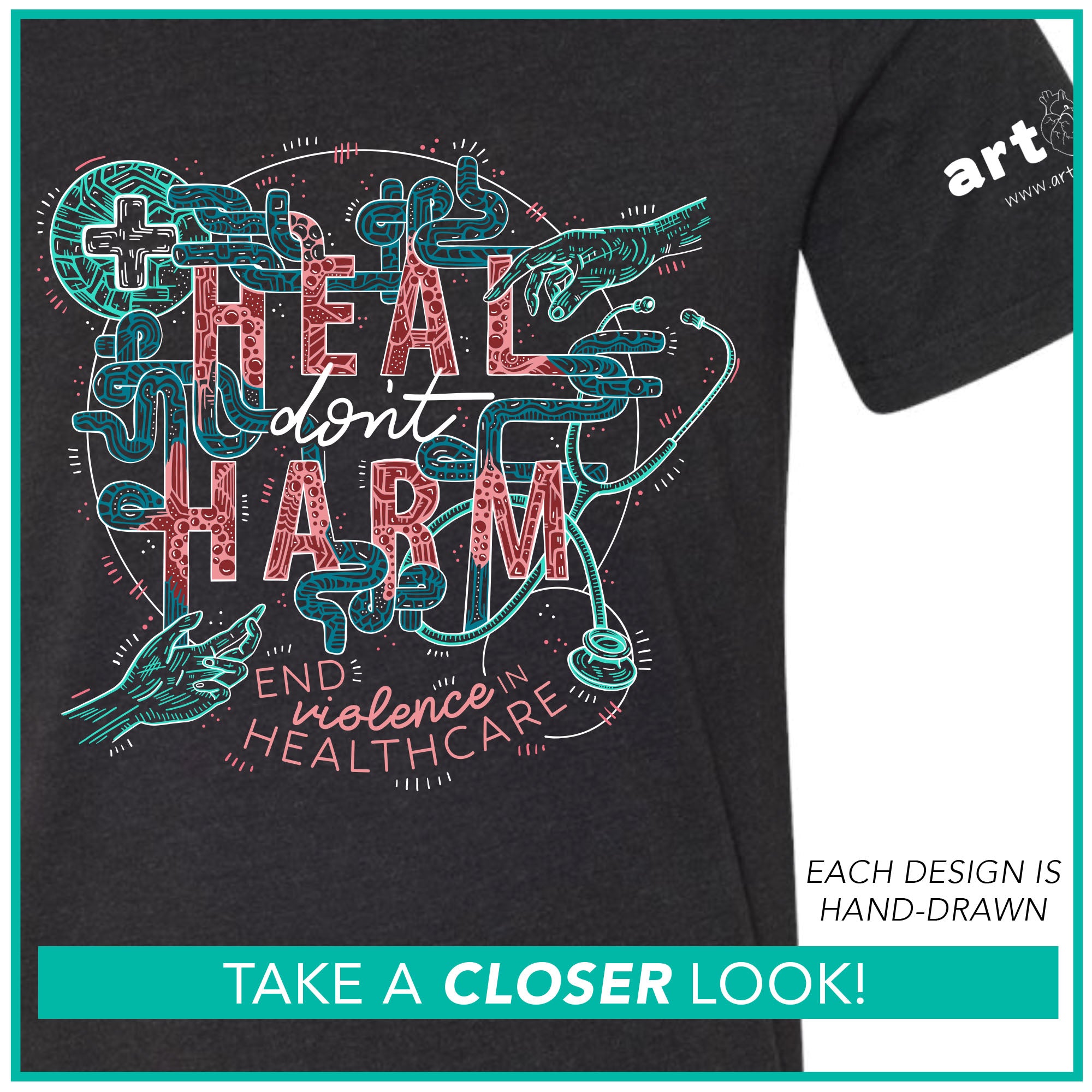 FRONT: "Heal, Don't Harm - End Violence In Healthcare" Design (printed in white, red, maroon, dark blue & teal)