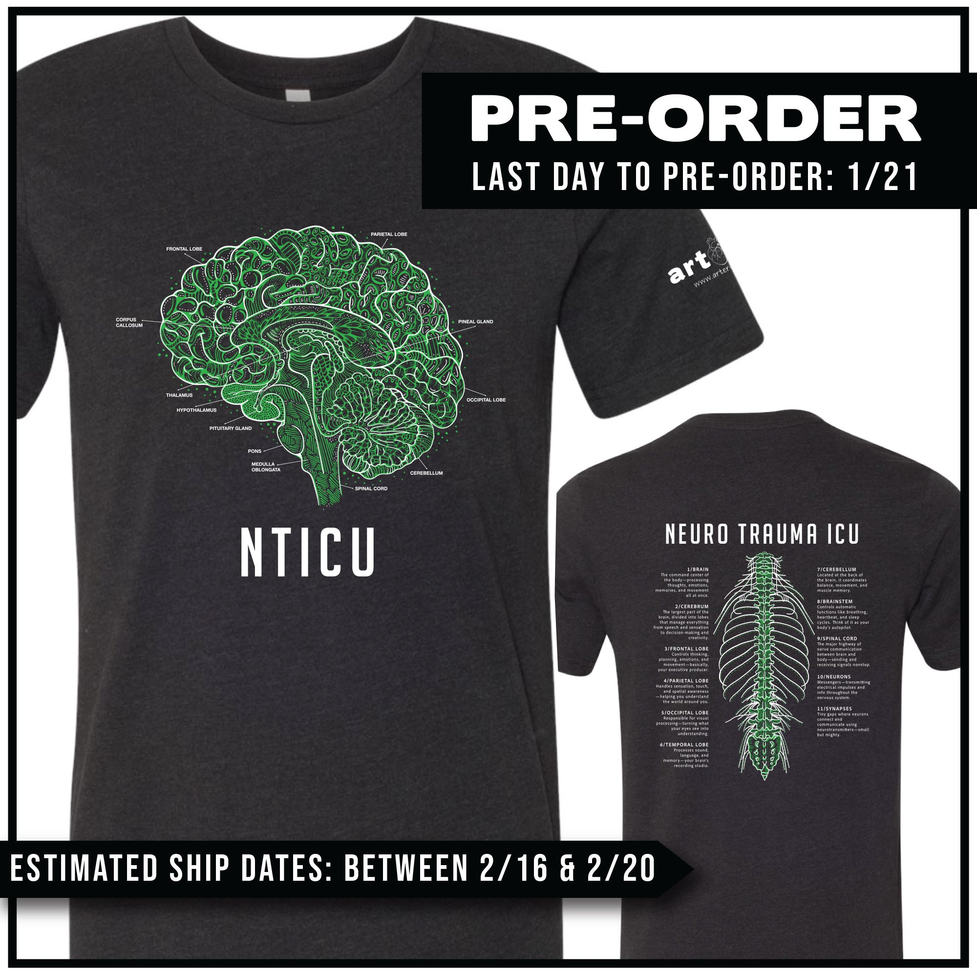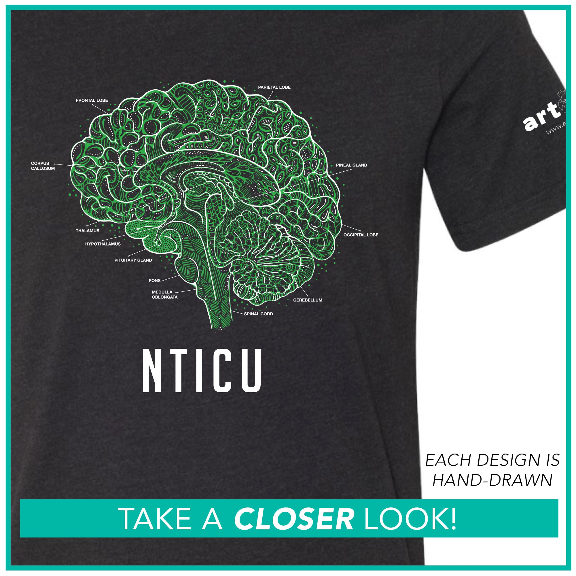 FRONT: Labeled Brain + "NTICU" (printed in white & green)