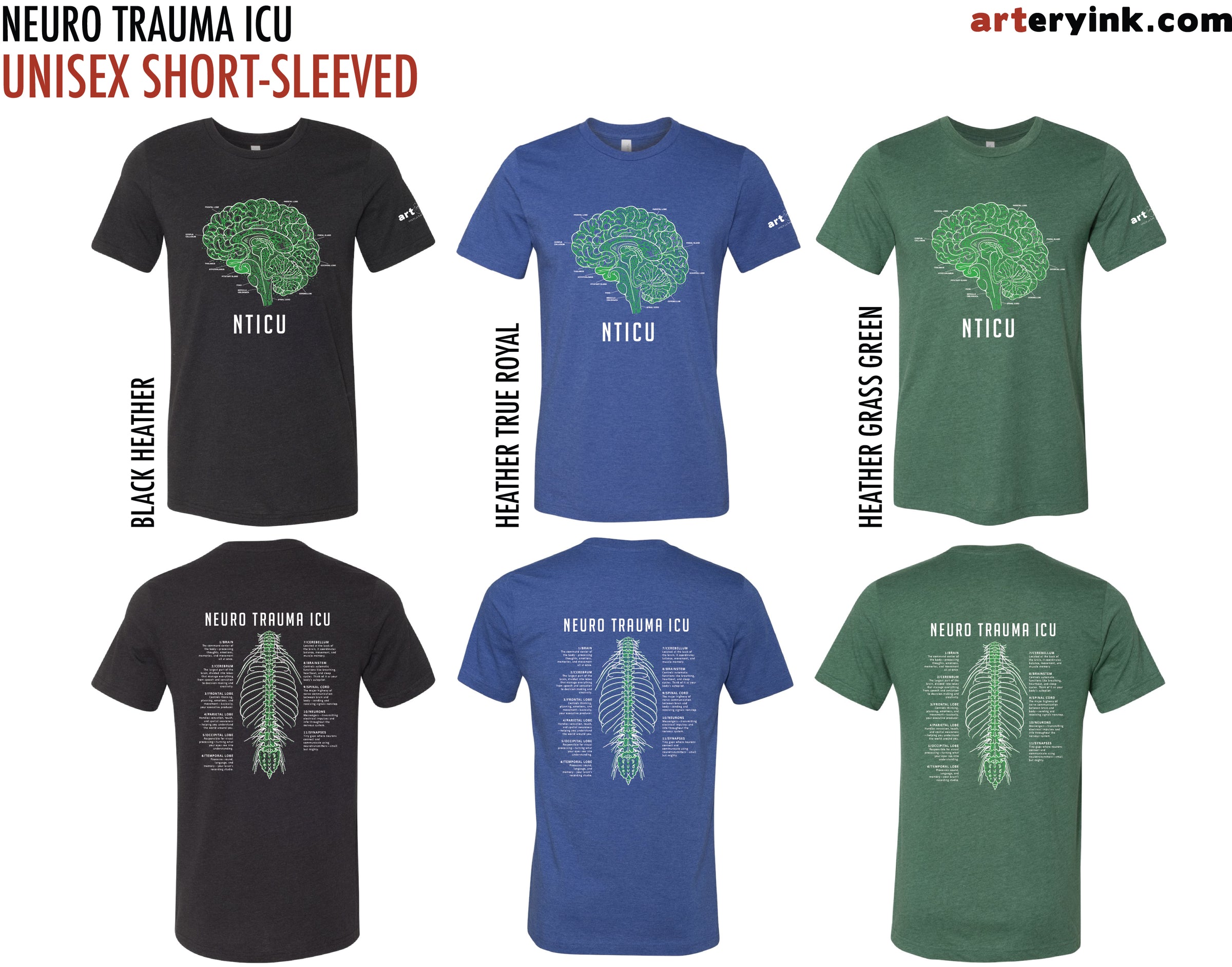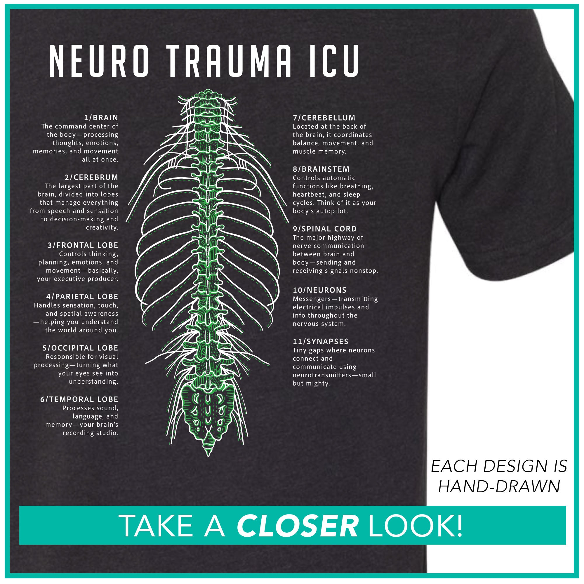BACK: "Neuro Trauma ICU" + Spine with Nerves and Anatomical Facts (printed in white & green)