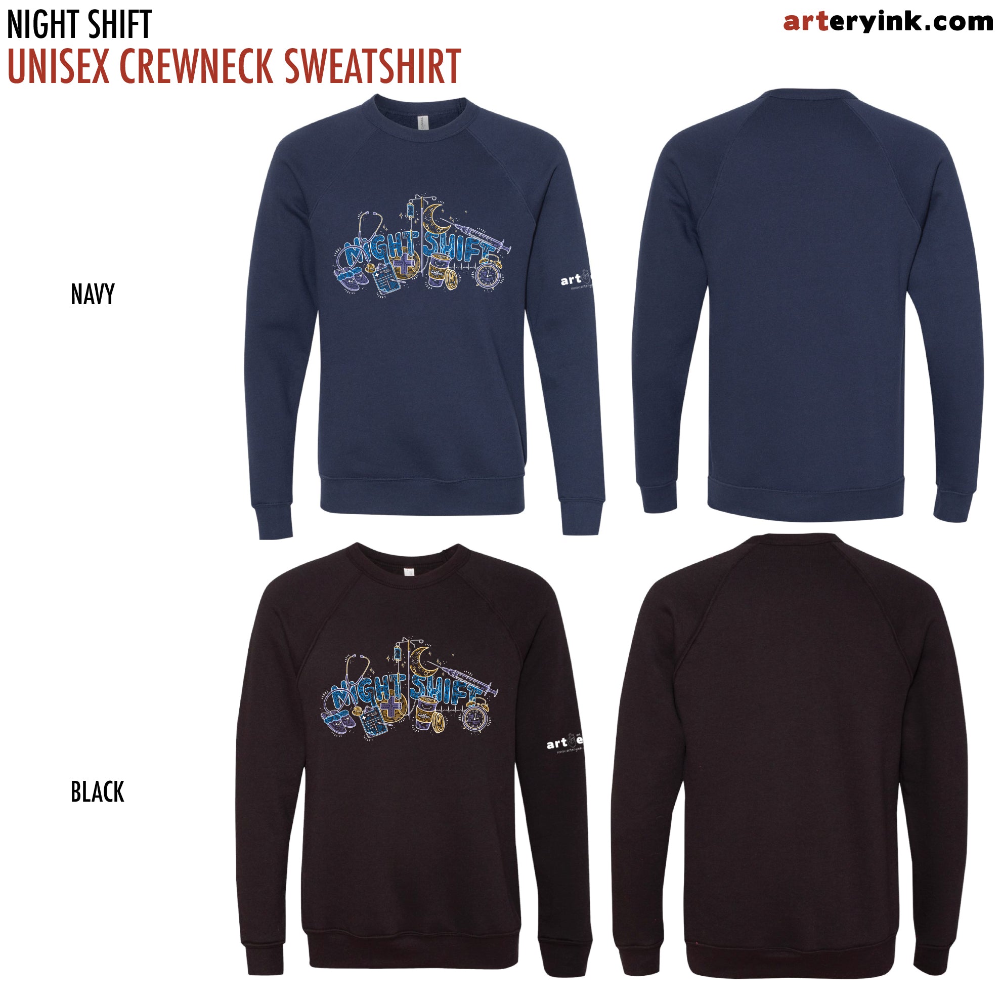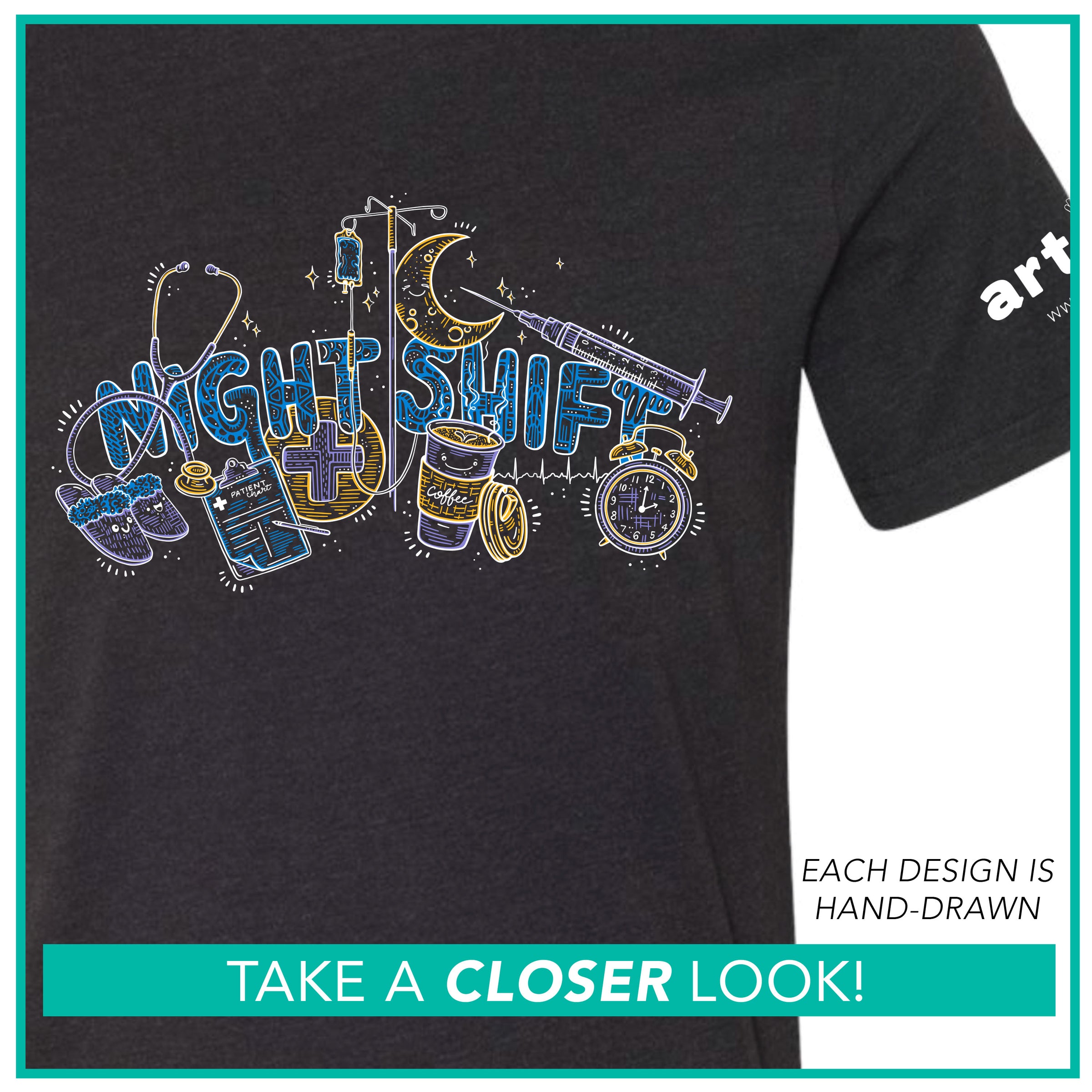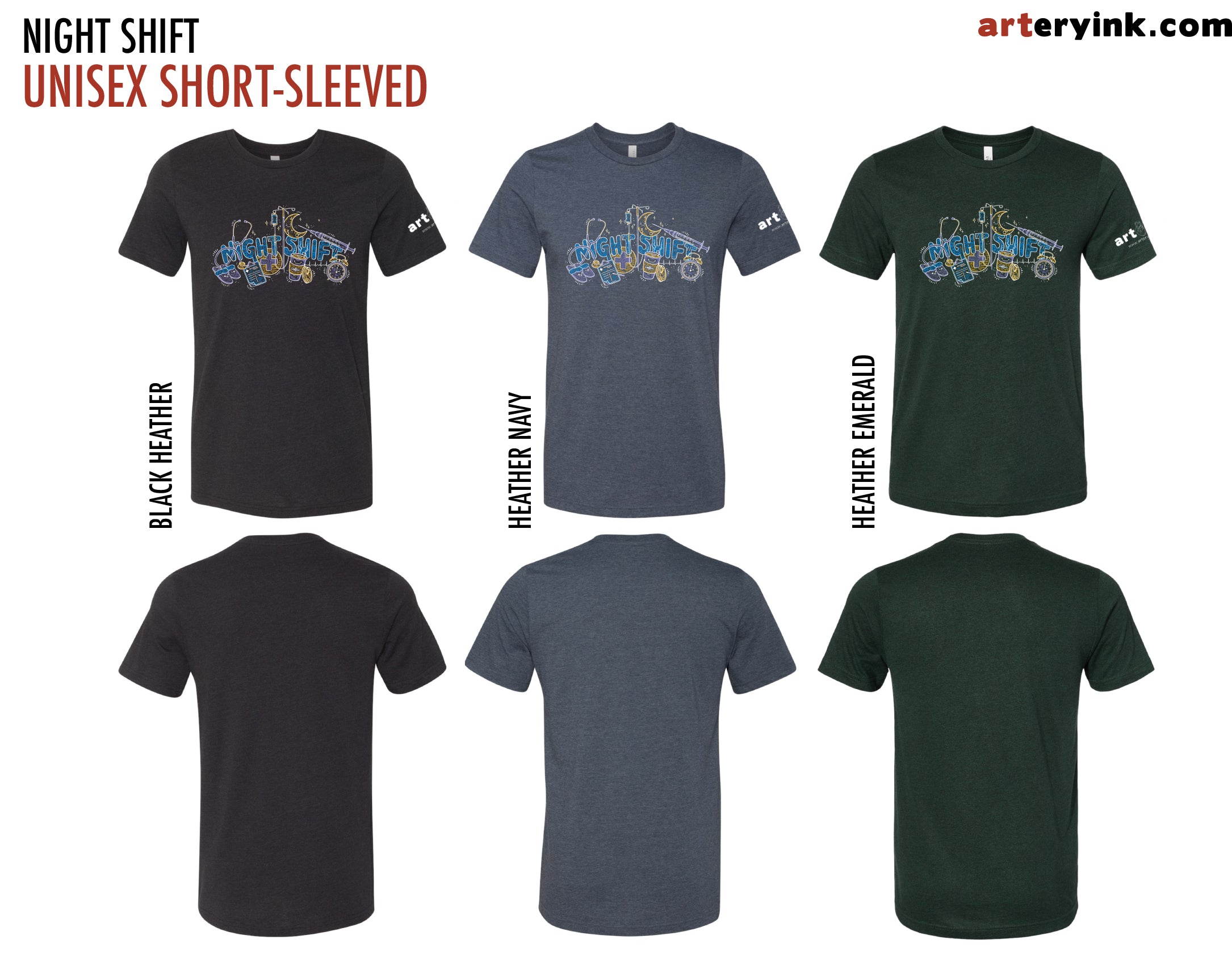 FRONT: "Night Shift" Design (printed in white, blue, yellow & purple)