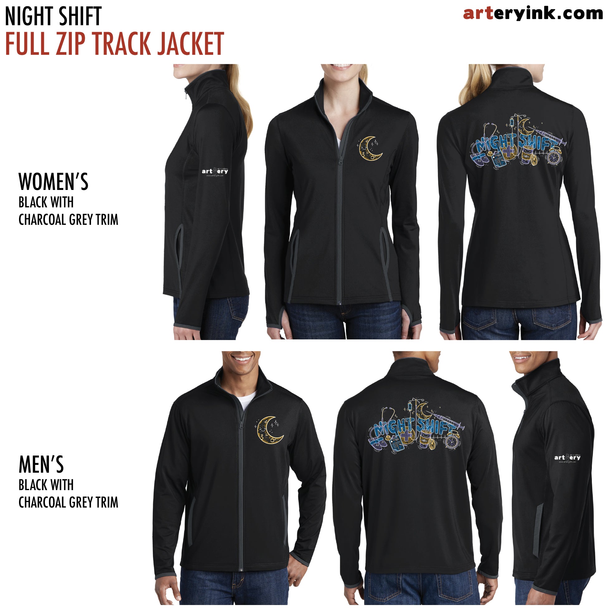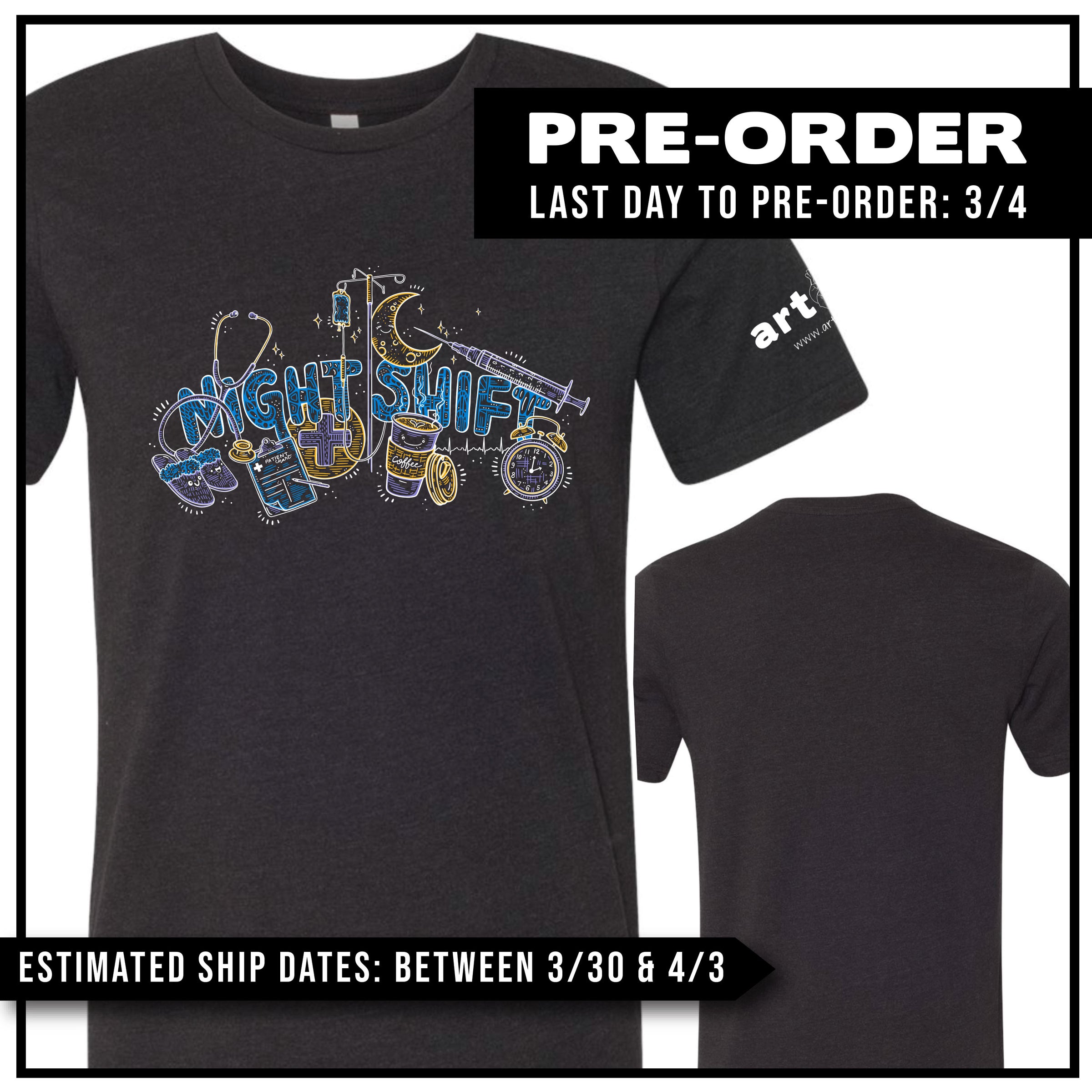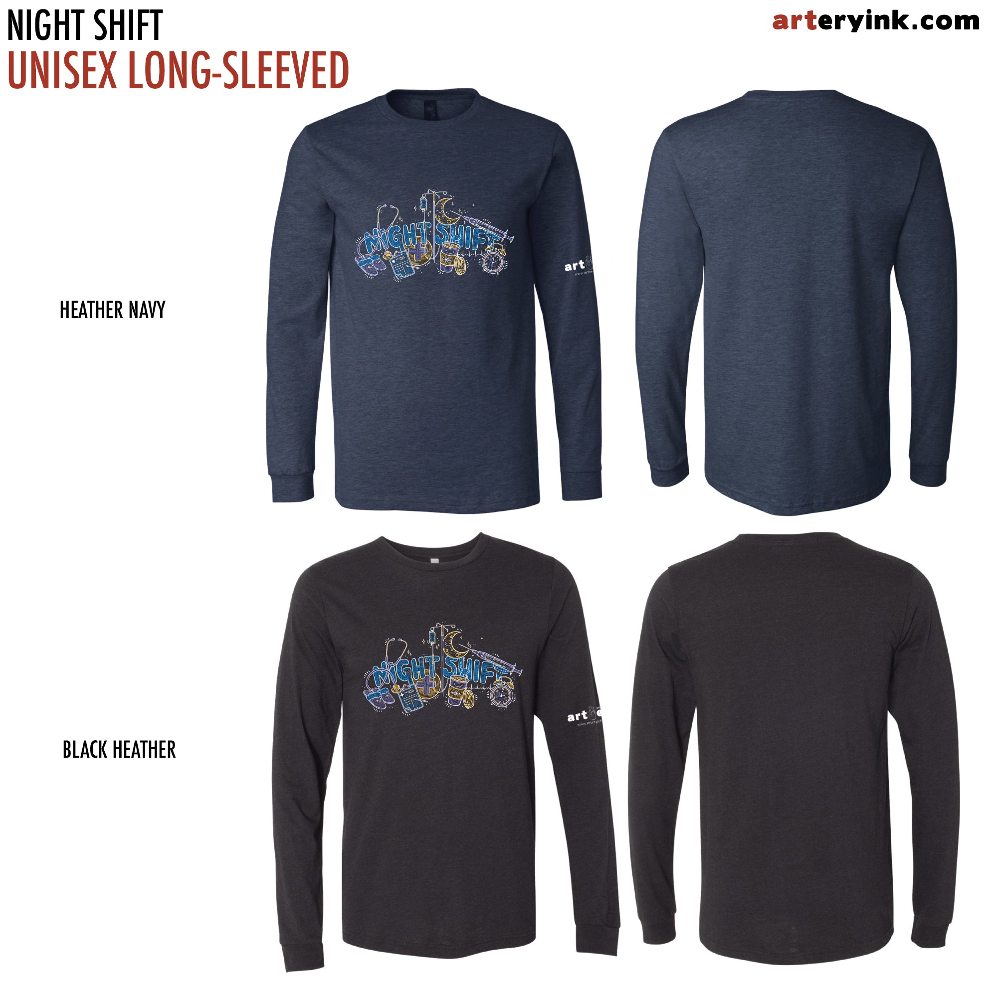 FRONT: "Night Shift" Design (printed in white, blue, yellow & purple)