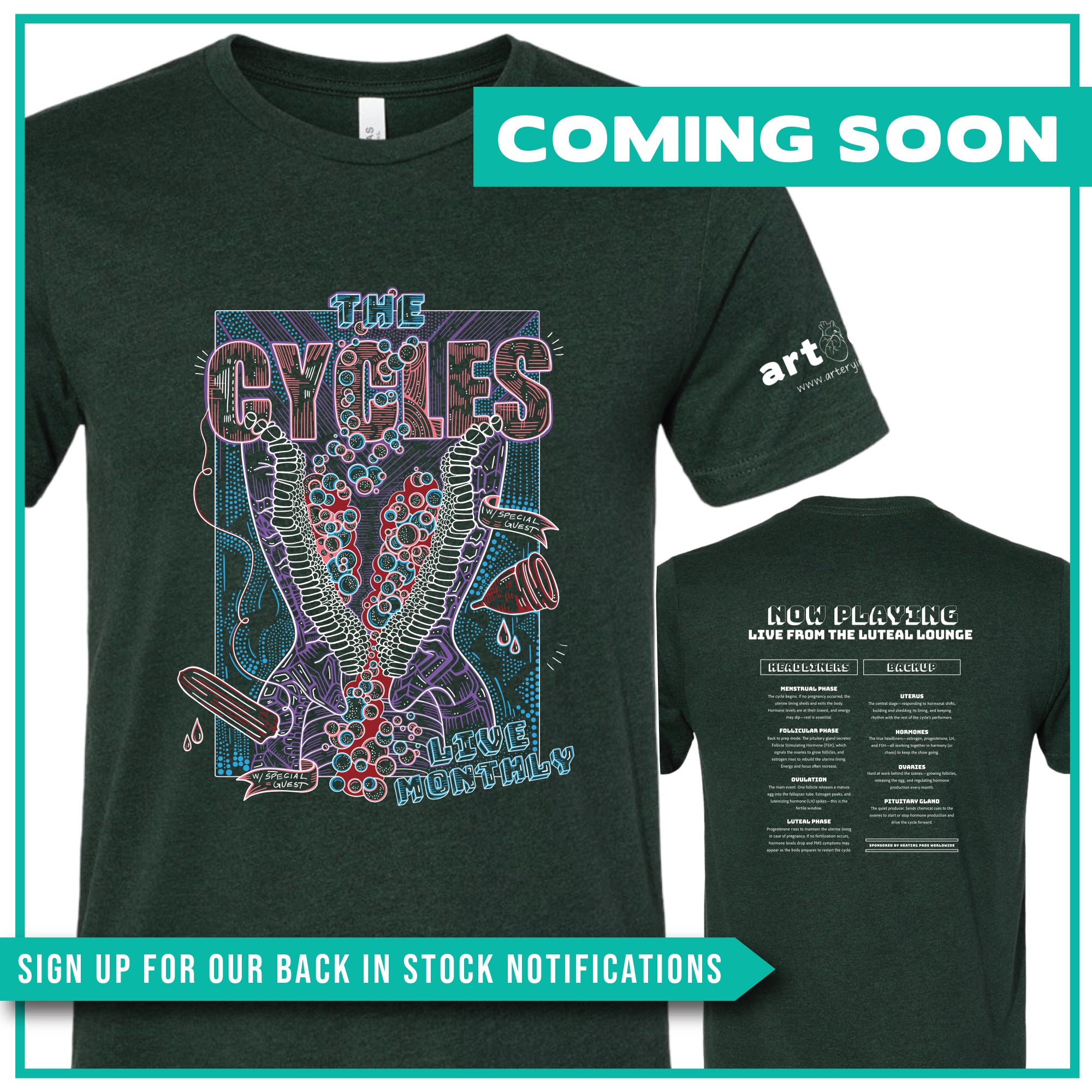 BACK: Now Playing Live from the Luteal Lounge + Sponsored by Heating Pads Worldwide. (Just like tour dates on the back of a band tee - this design includes lots of fun info about the menstrual cycle!)