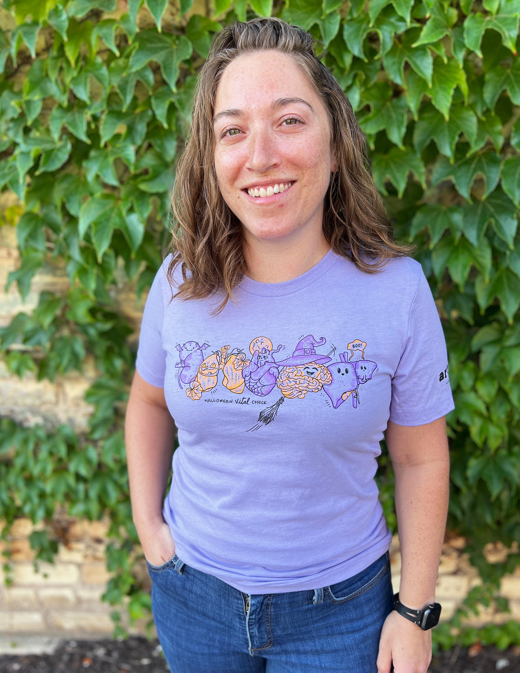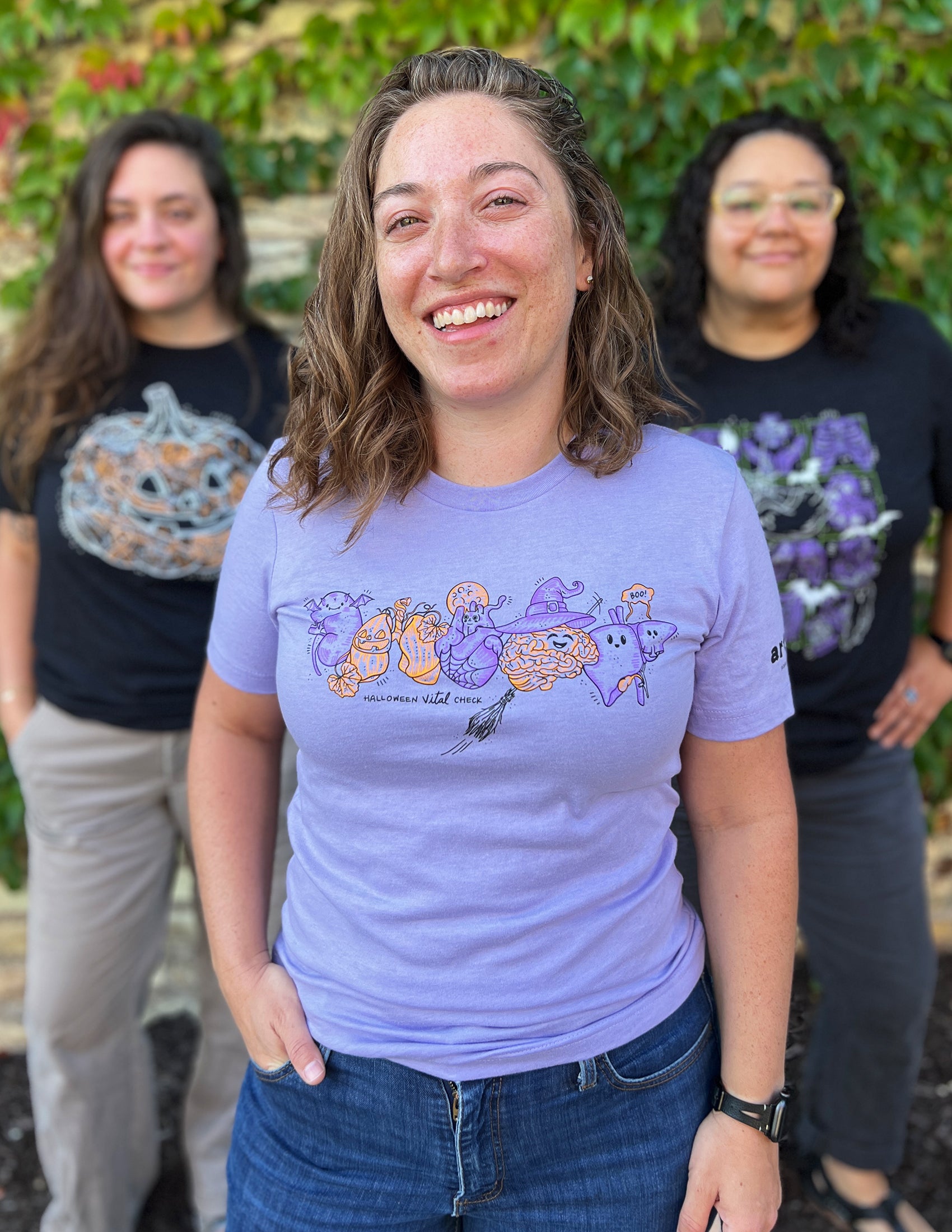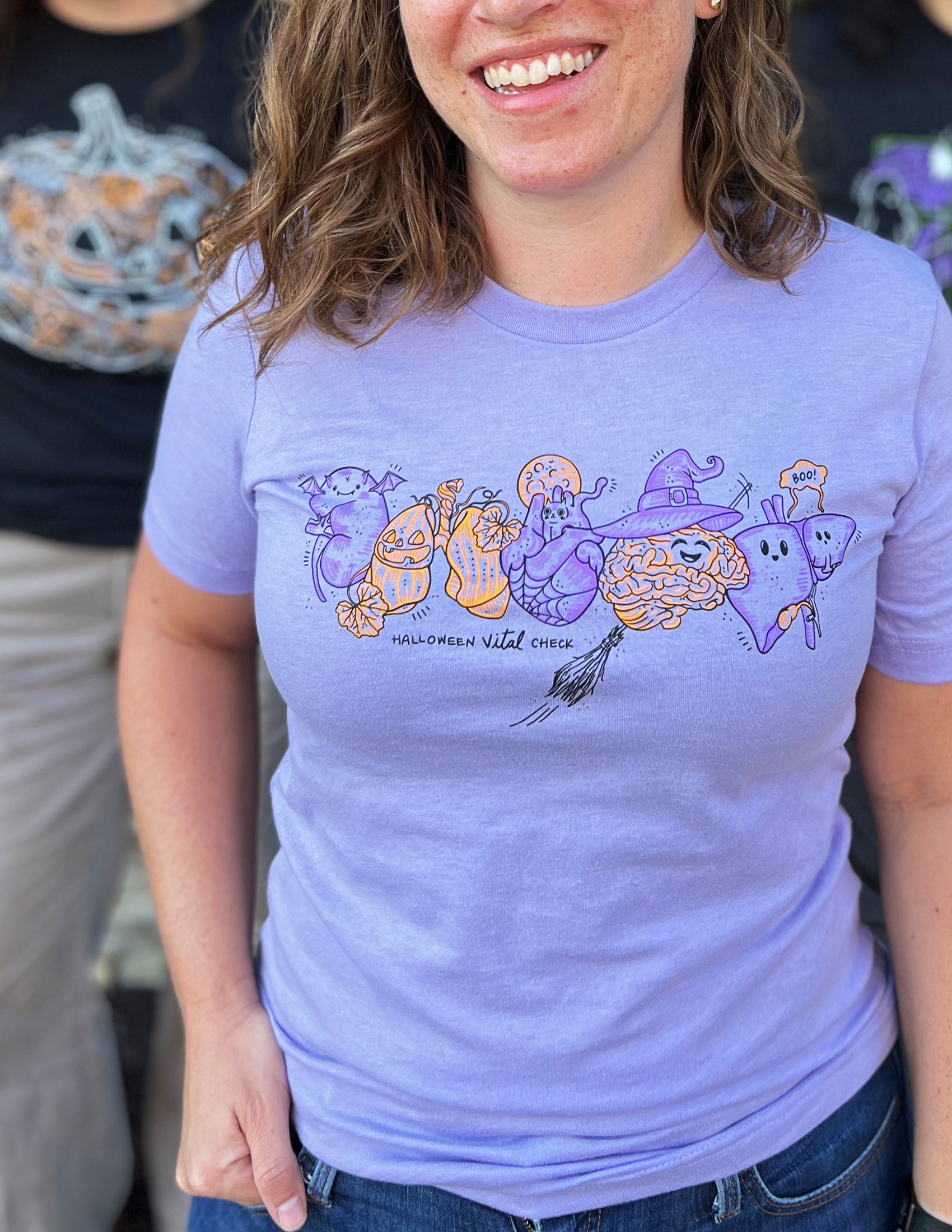 FRONT: Your VITAL organs dressed for halloween! Kidney as a bat, Lungs as a jack-o'-lantern, Heart with a black cat & spider web, brain as a witch and your liver as a cute ghost + "Halloween Vital Check"!