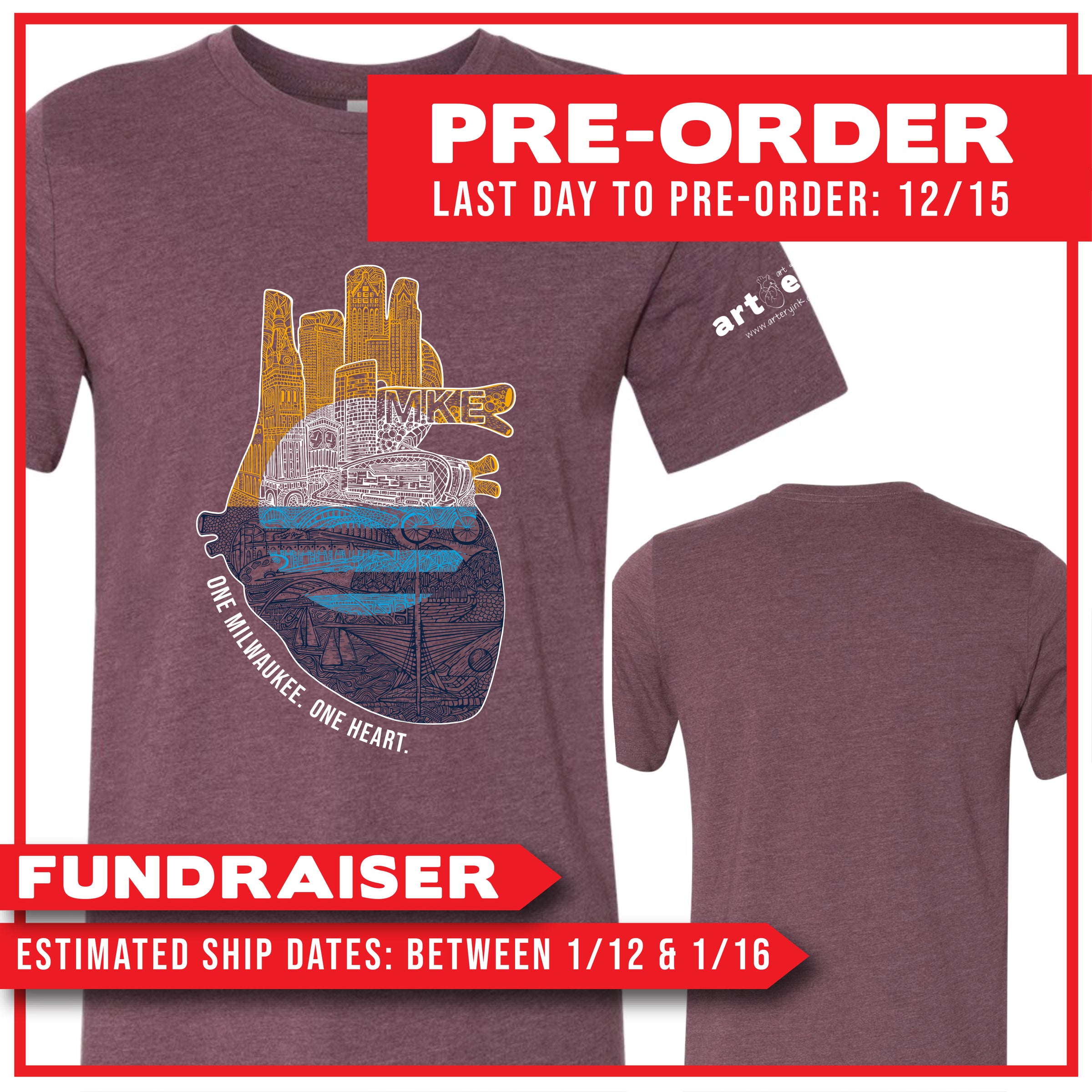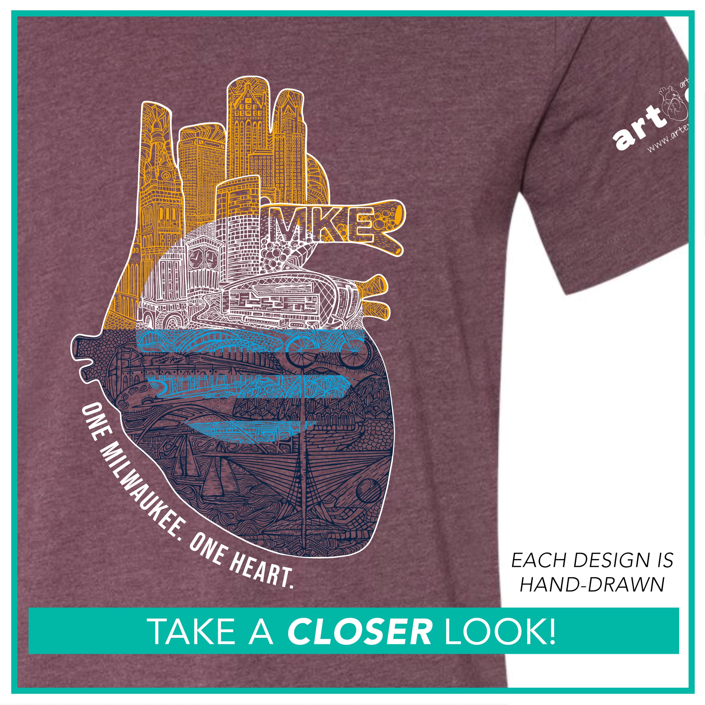 FRONT: Heart of Milwaukee + "One Milwaukee. One Heart" (printed in The People's Flag Colors - white, yellow, blue & navy)