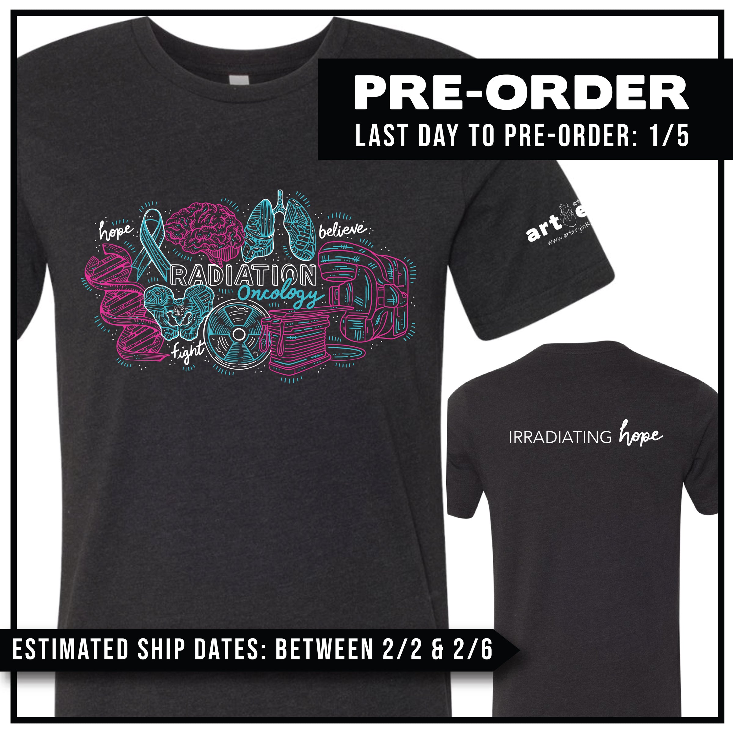 FRONT: "Radiation Oncology" Mini Icon Collage (printed in white, pink & blue)