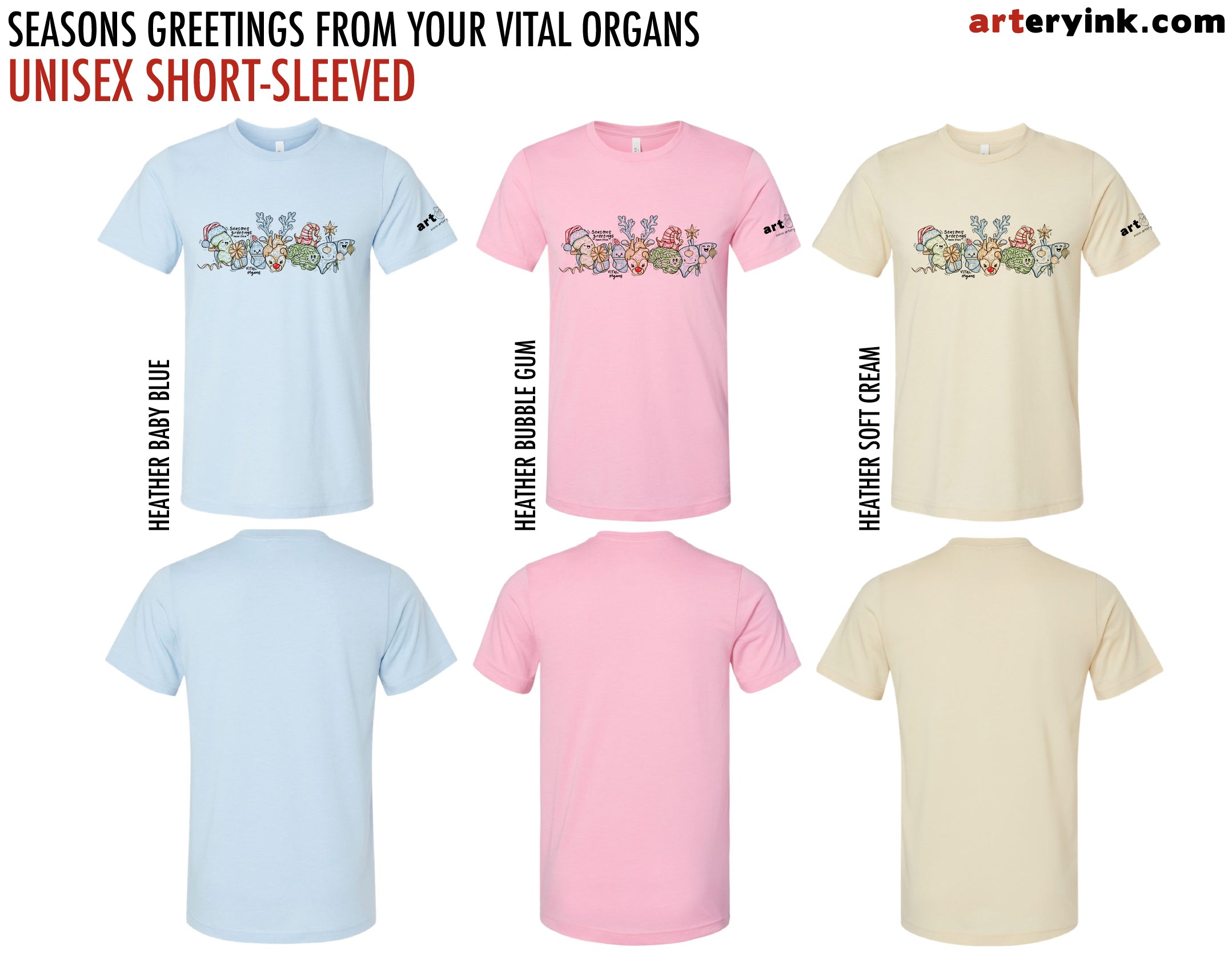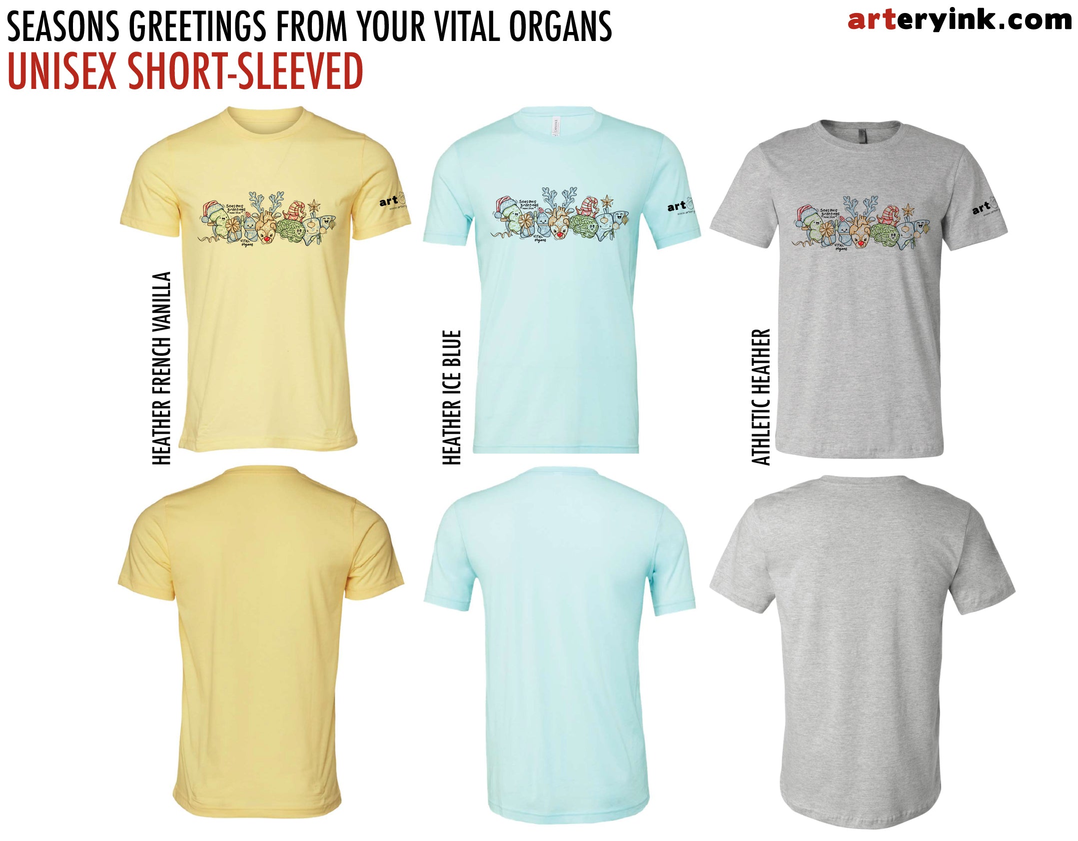 FRONT: Your five vital organs dressed for the season! Kidney wearing a Santa hat, lungs wrapped as a present, heart dressed as Rudolph, brain with an elf hat, and your liver dressed as a tree! Includes the text "seasons greetings from your vital organs" (printed in black, red, green, blue & yellow)