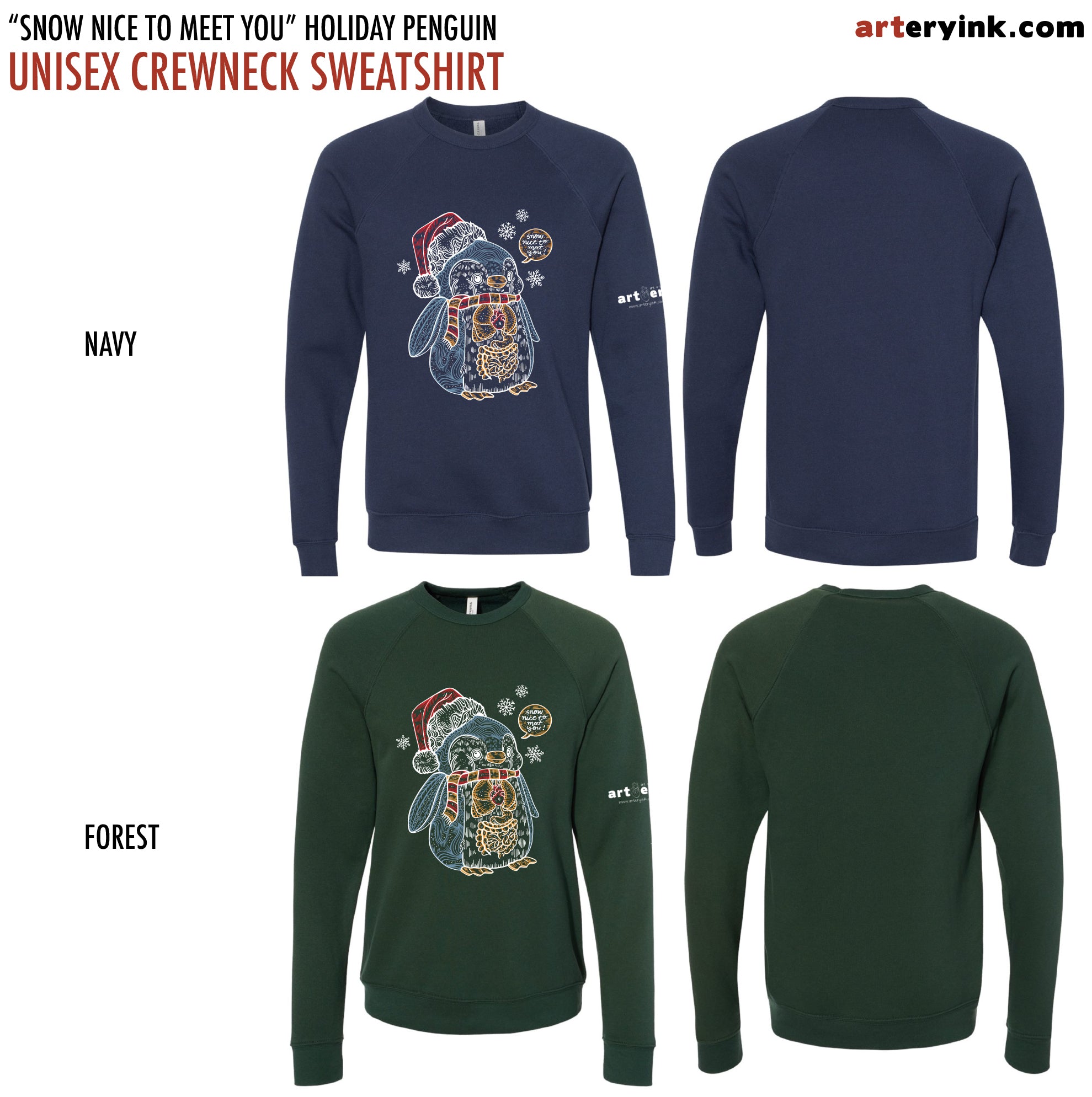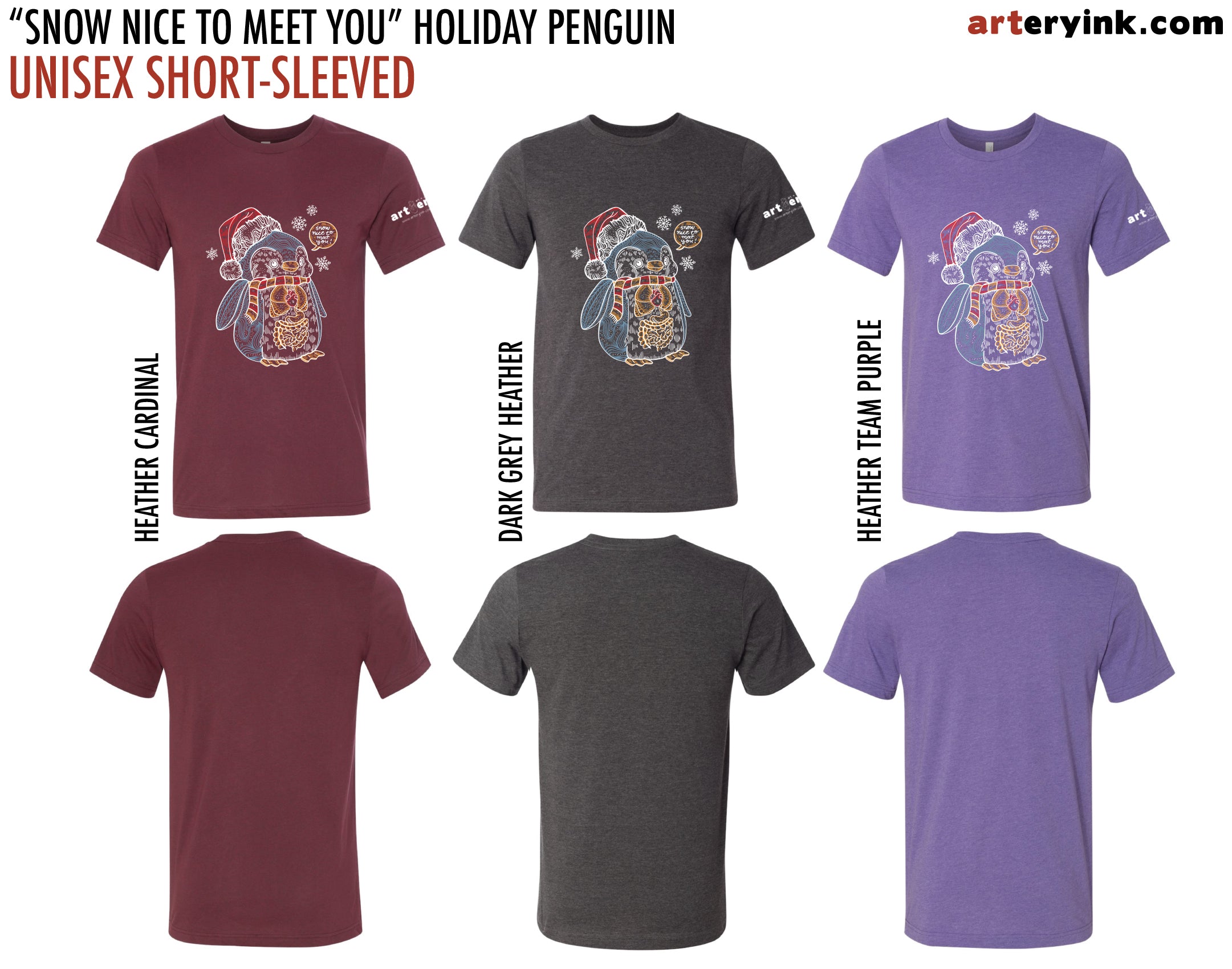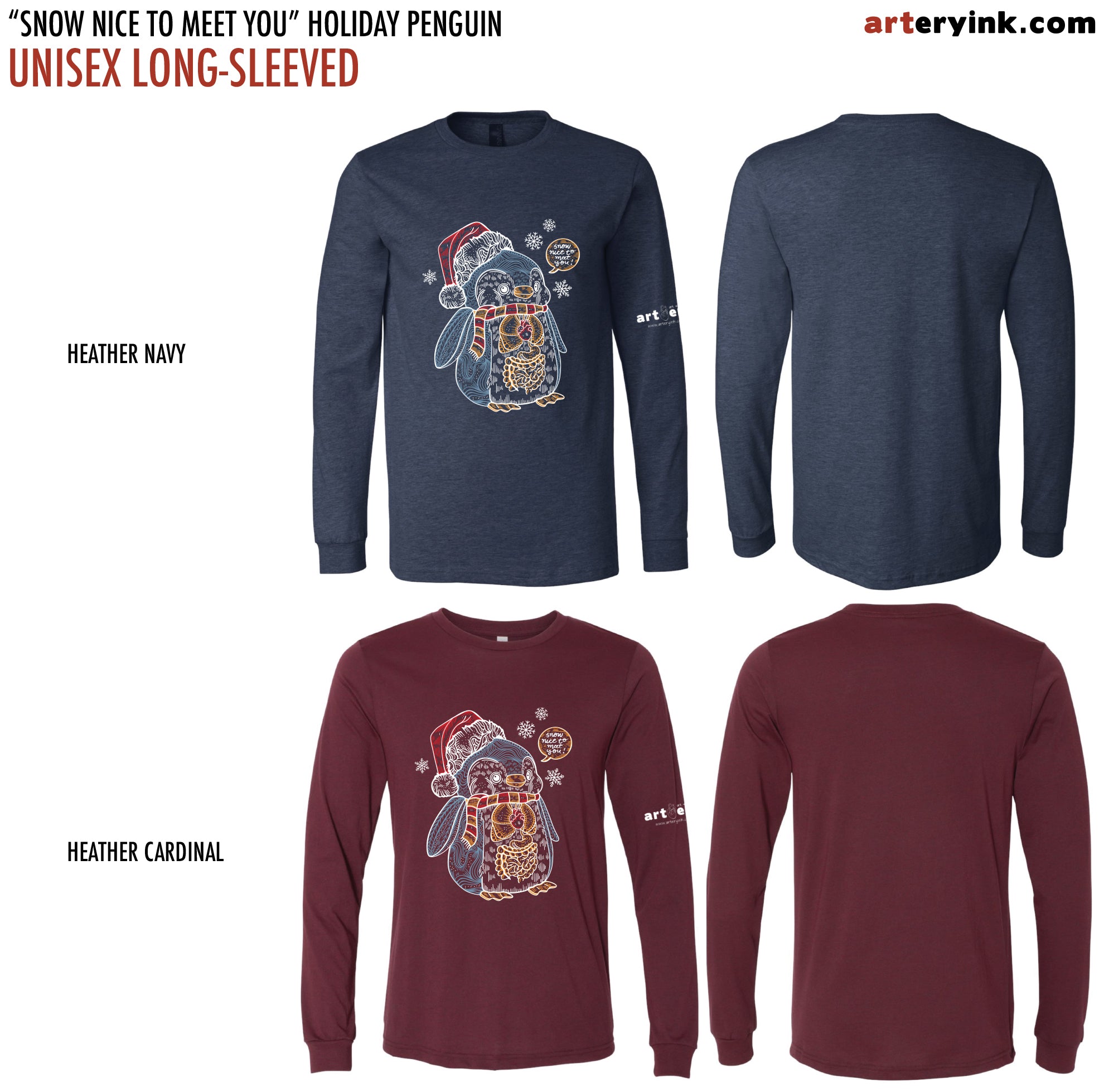 Cute holiday penguin design - wearing a Santa hat and a scarf. Includes the heart, lungs and GI system + "snow nice to meet you" (printed in white, blue, yellow and red)
