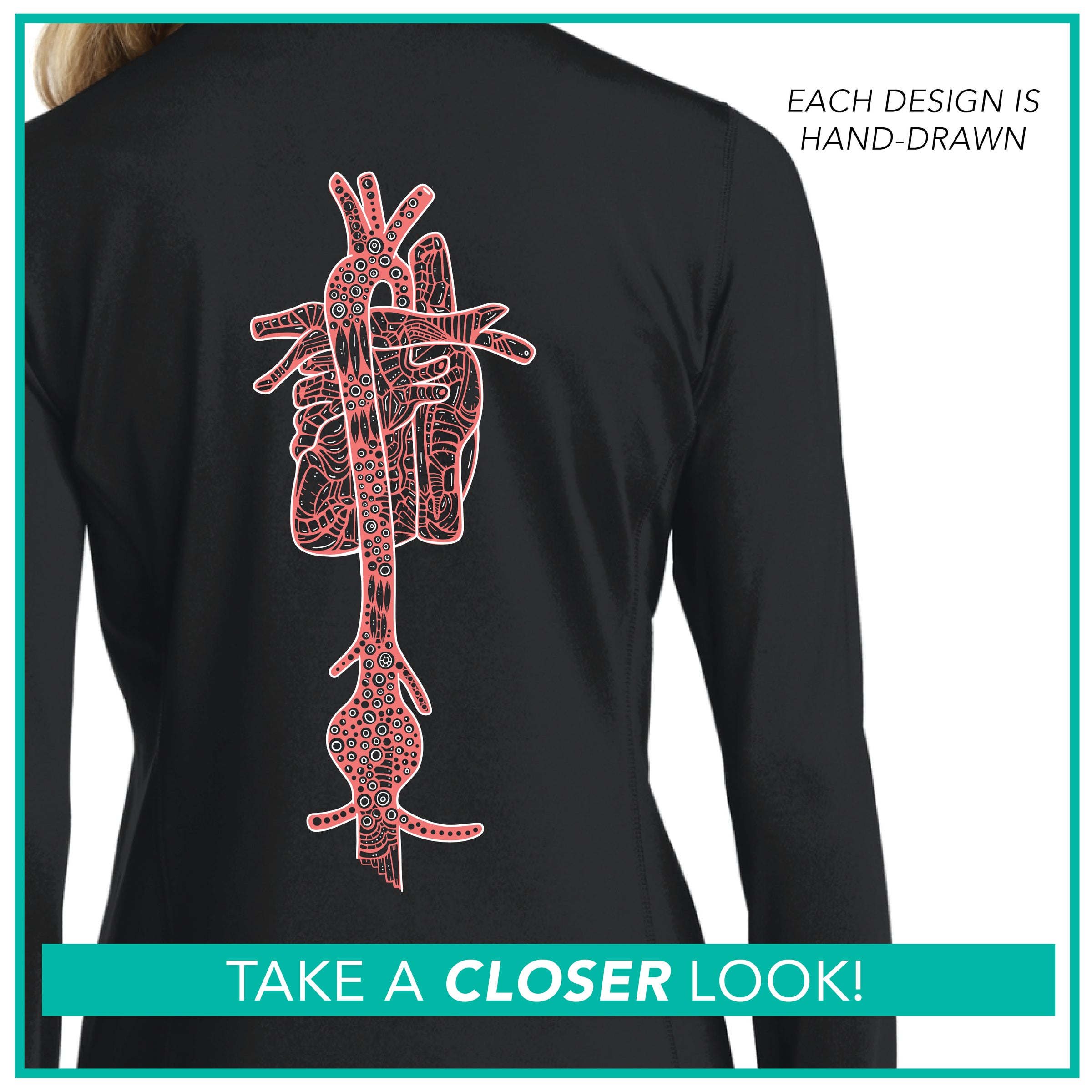 BACK: Heart with Abdominal Aortic Aneurysm Design (printed in white and coral)