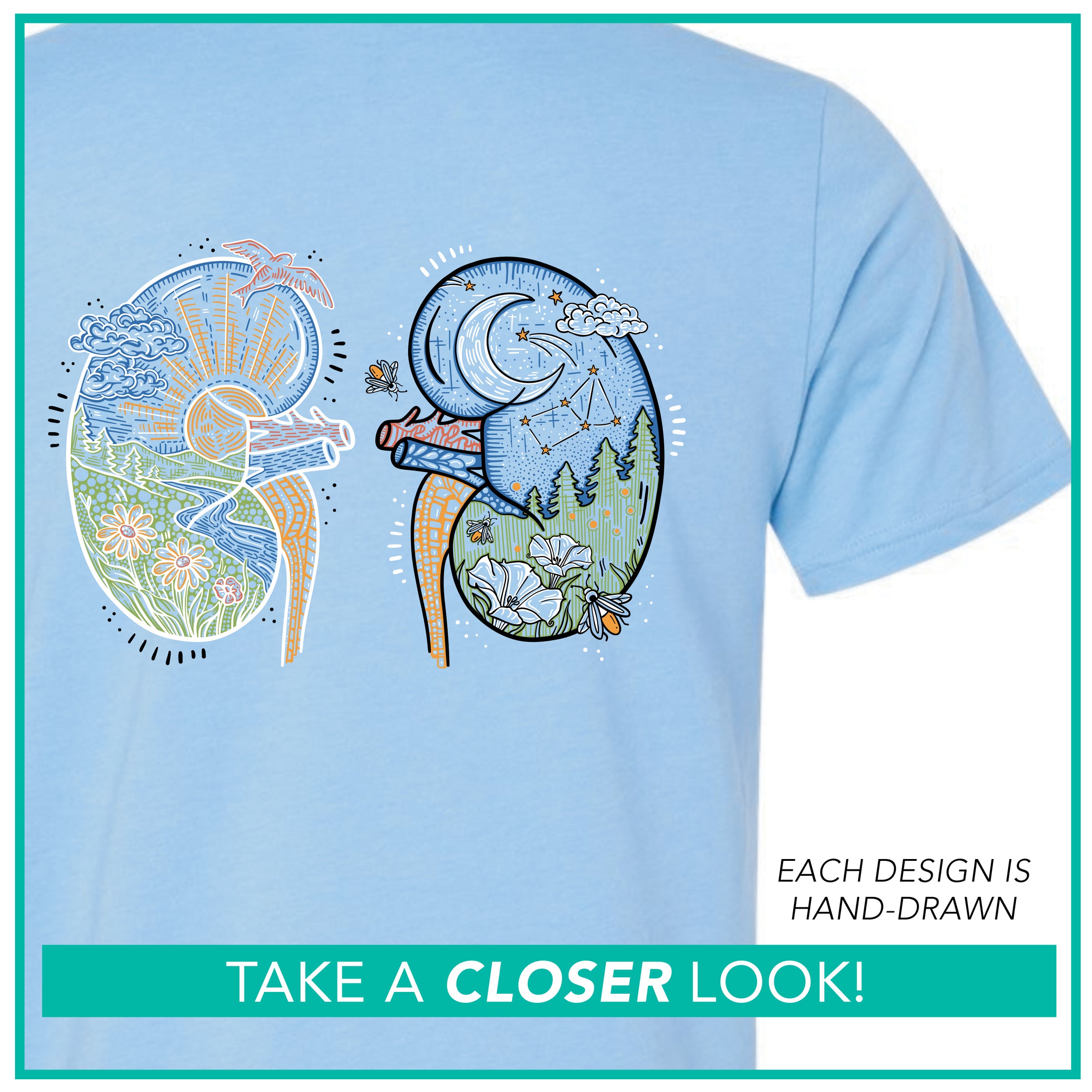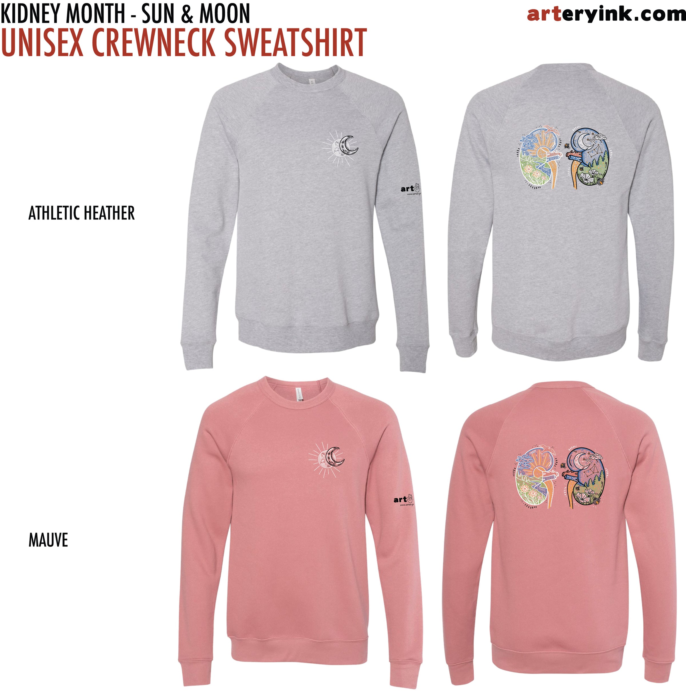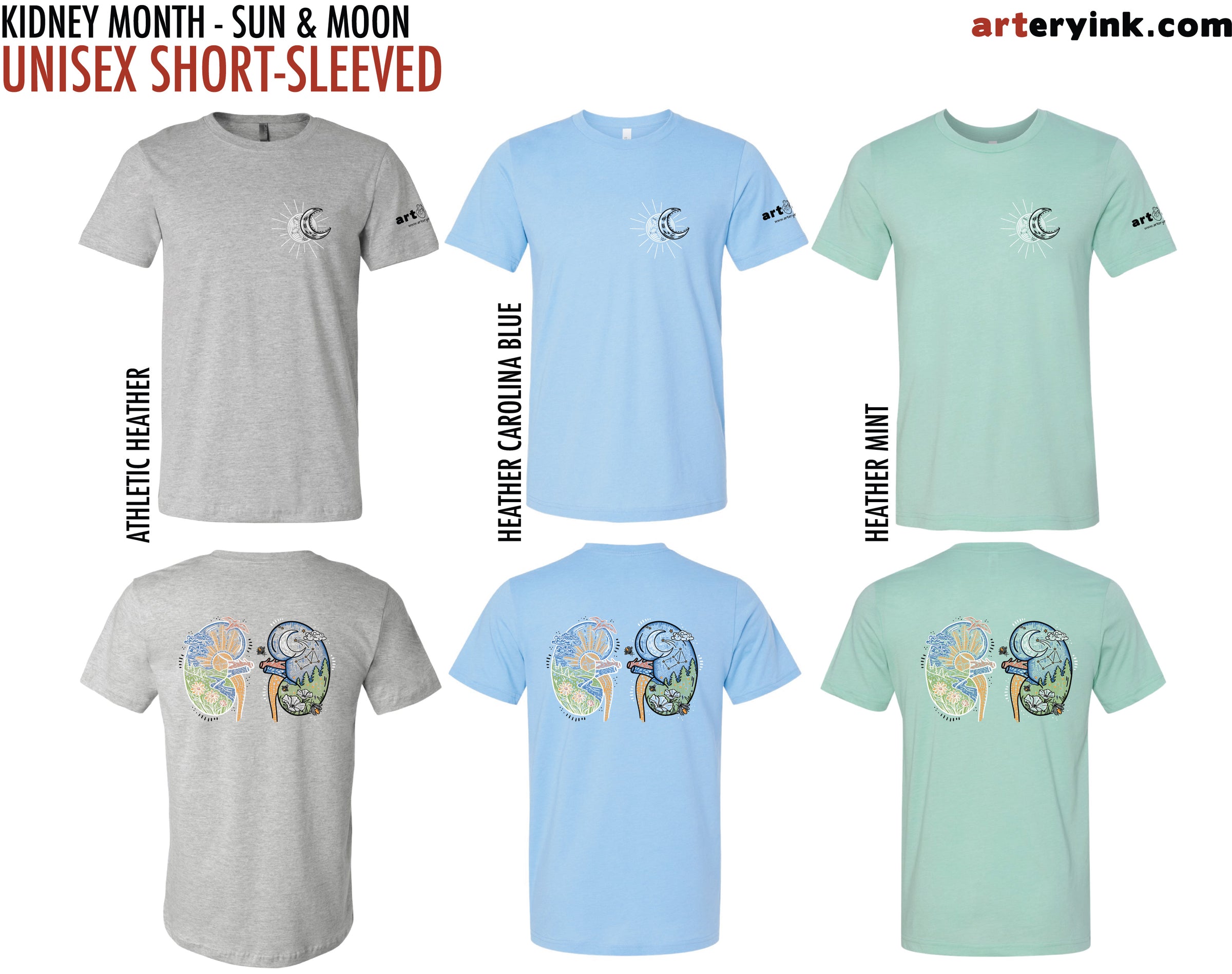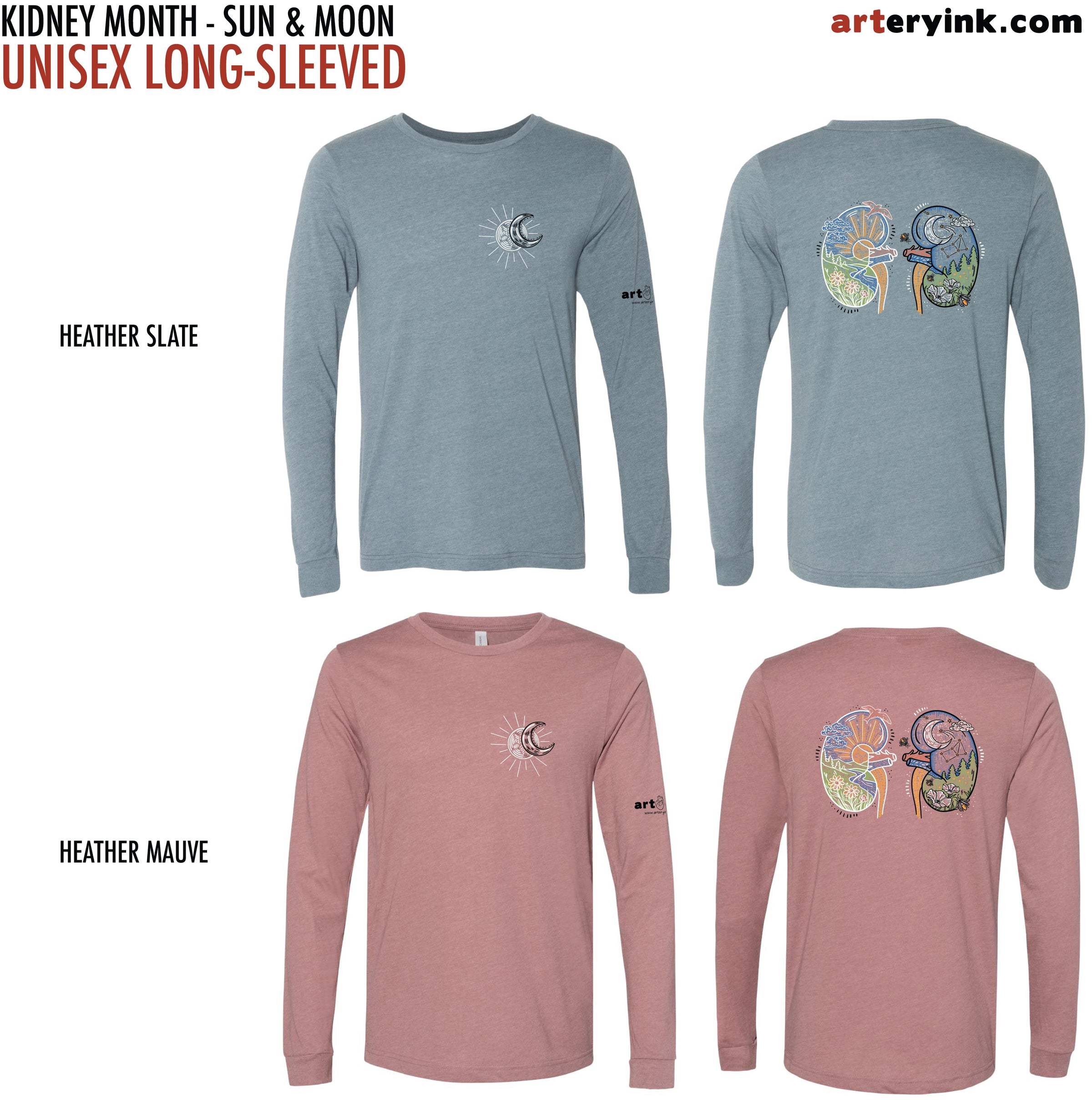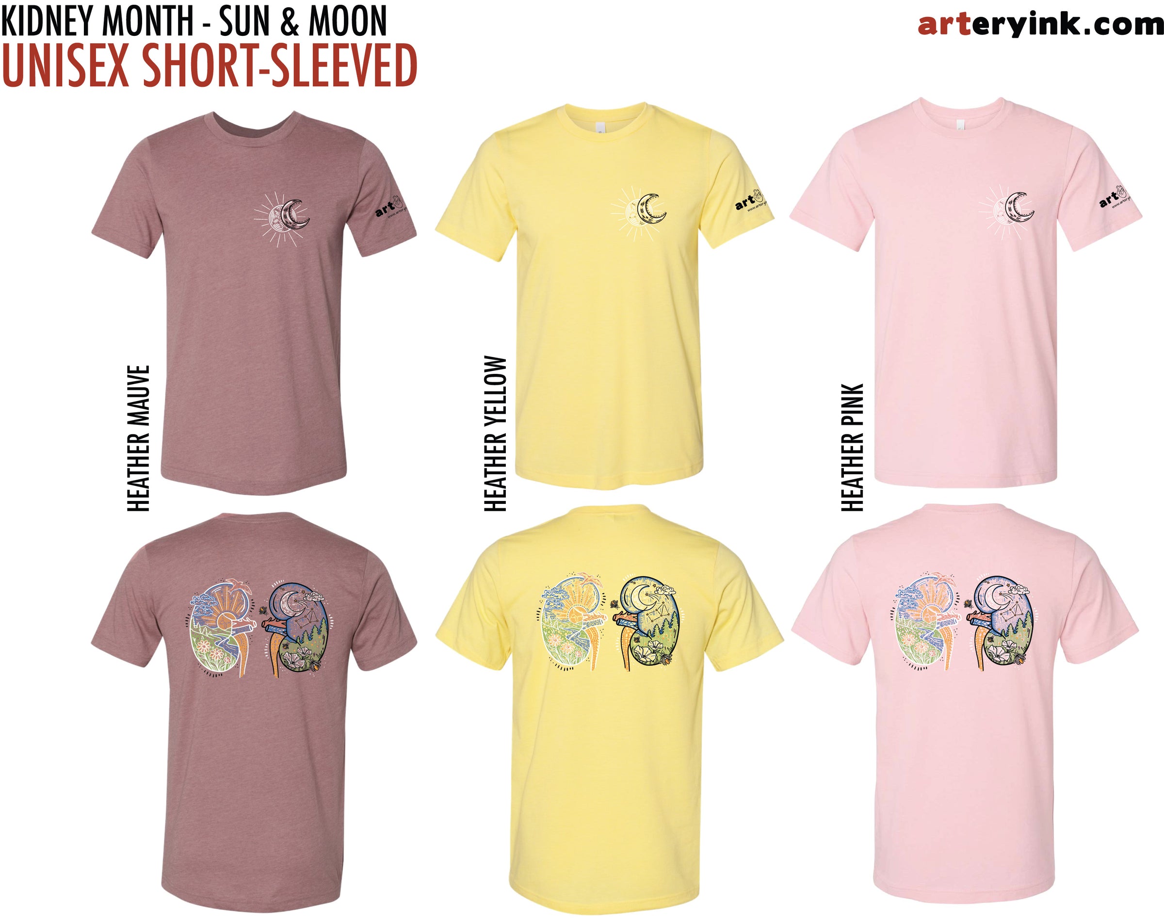 BACK: Sun & Moon Dual Kidney Designs (printed in blue, green, red, yellow, white & black)