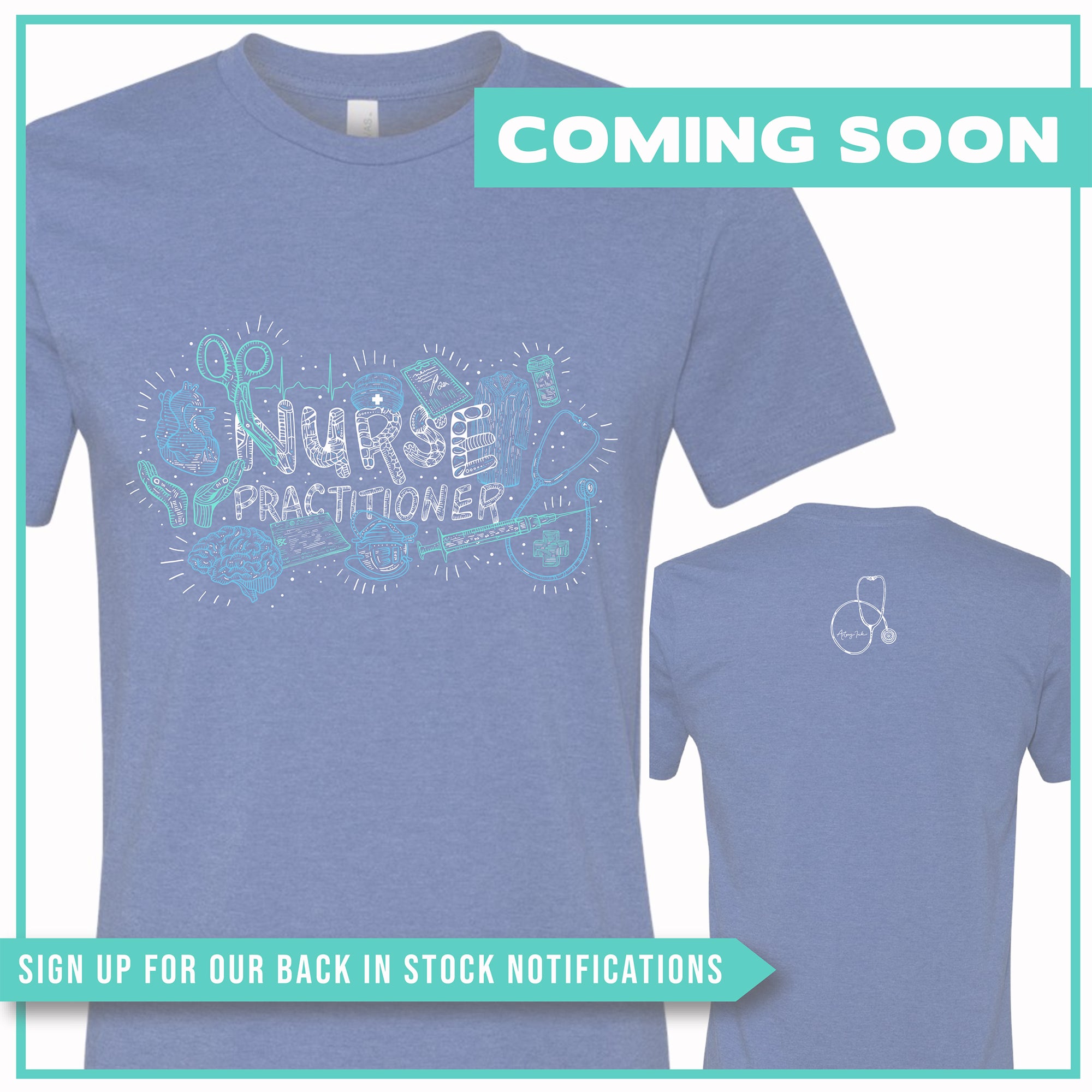 FRONT: "Nurse Practitioner" Word Design (printed in white, blue & teal)
