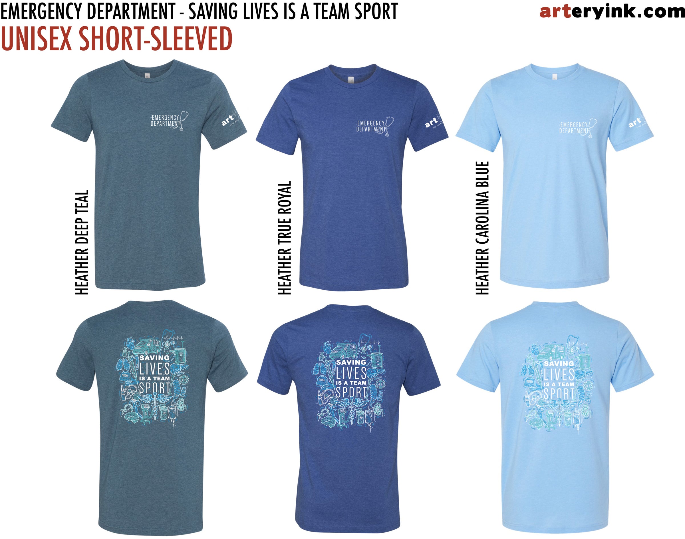BACK: "Saving Lives is a Team Sport" Mini Icon Collage (printed in white, teal & blue)