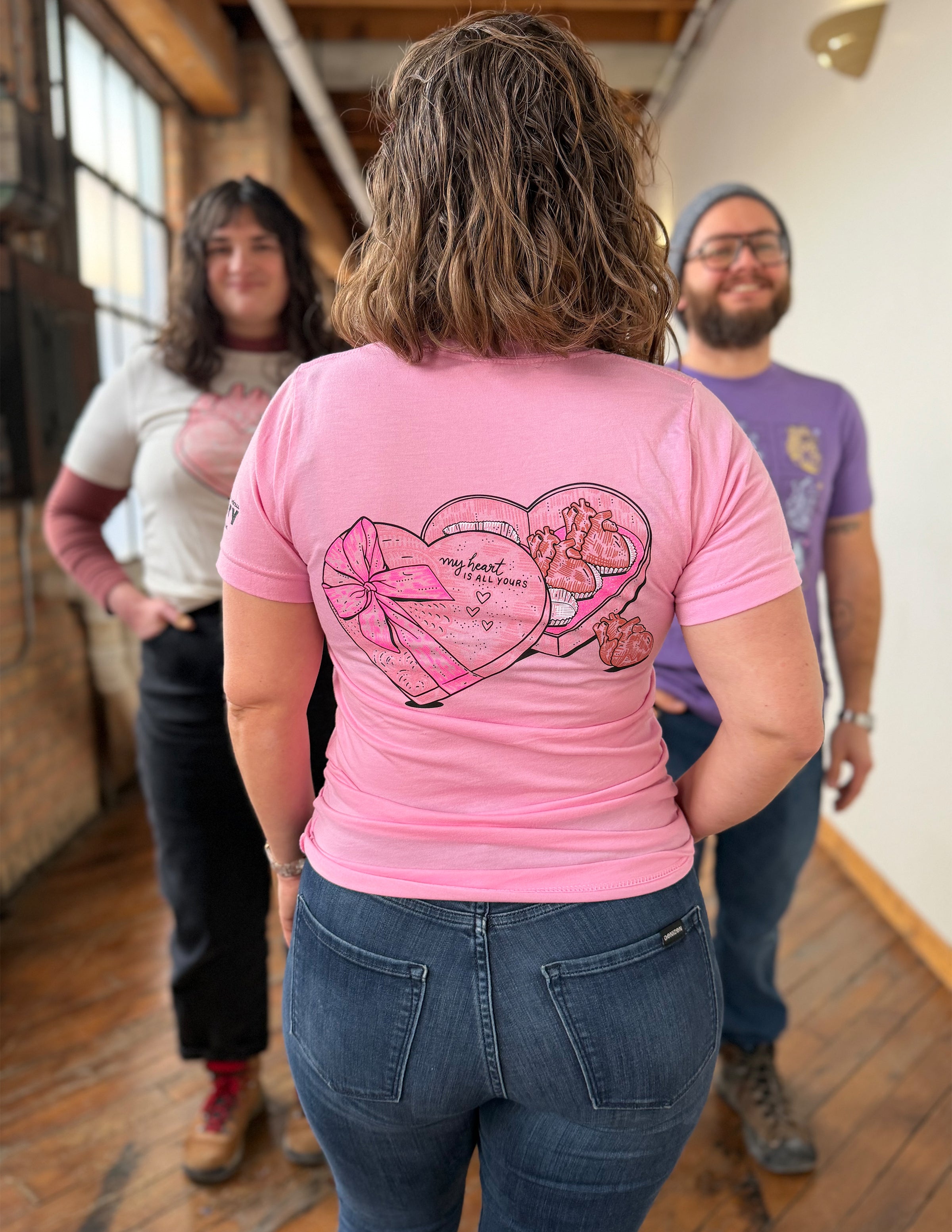SHIRT COLORS: Heather Bubble Gum with Black, White, Hot Pink, Light Pink, Chocolate Brown print