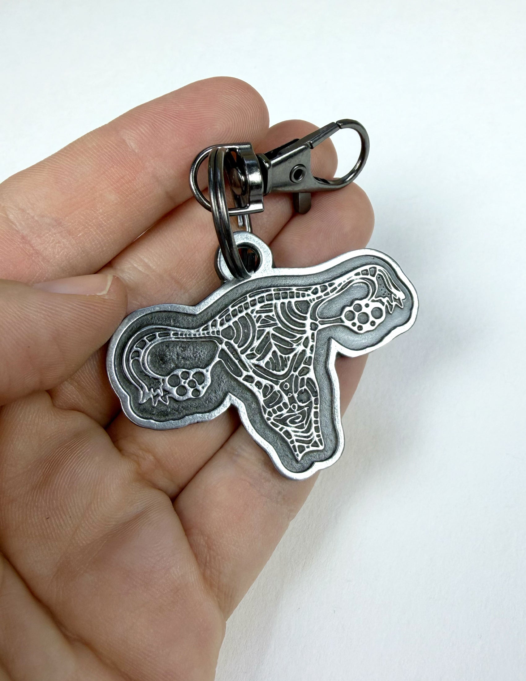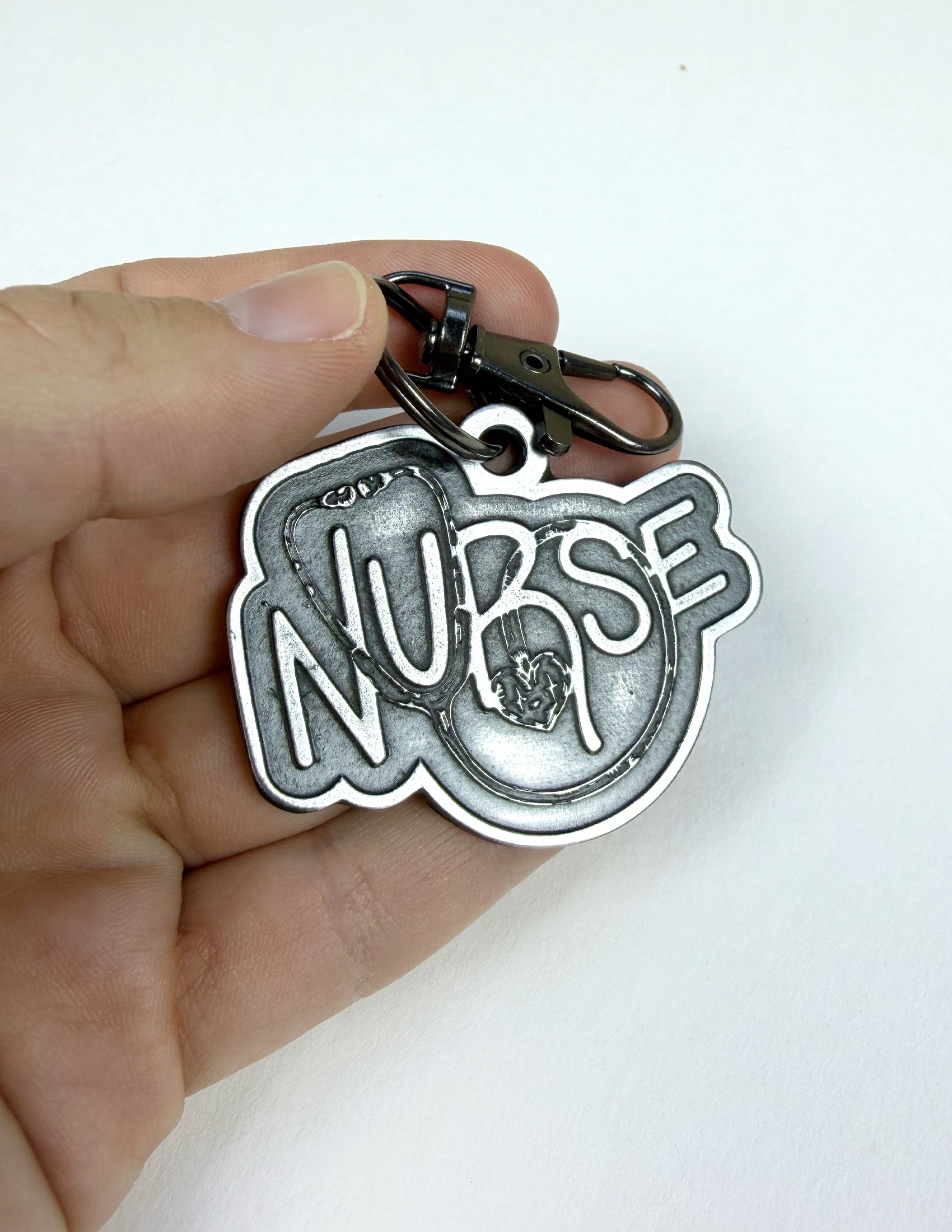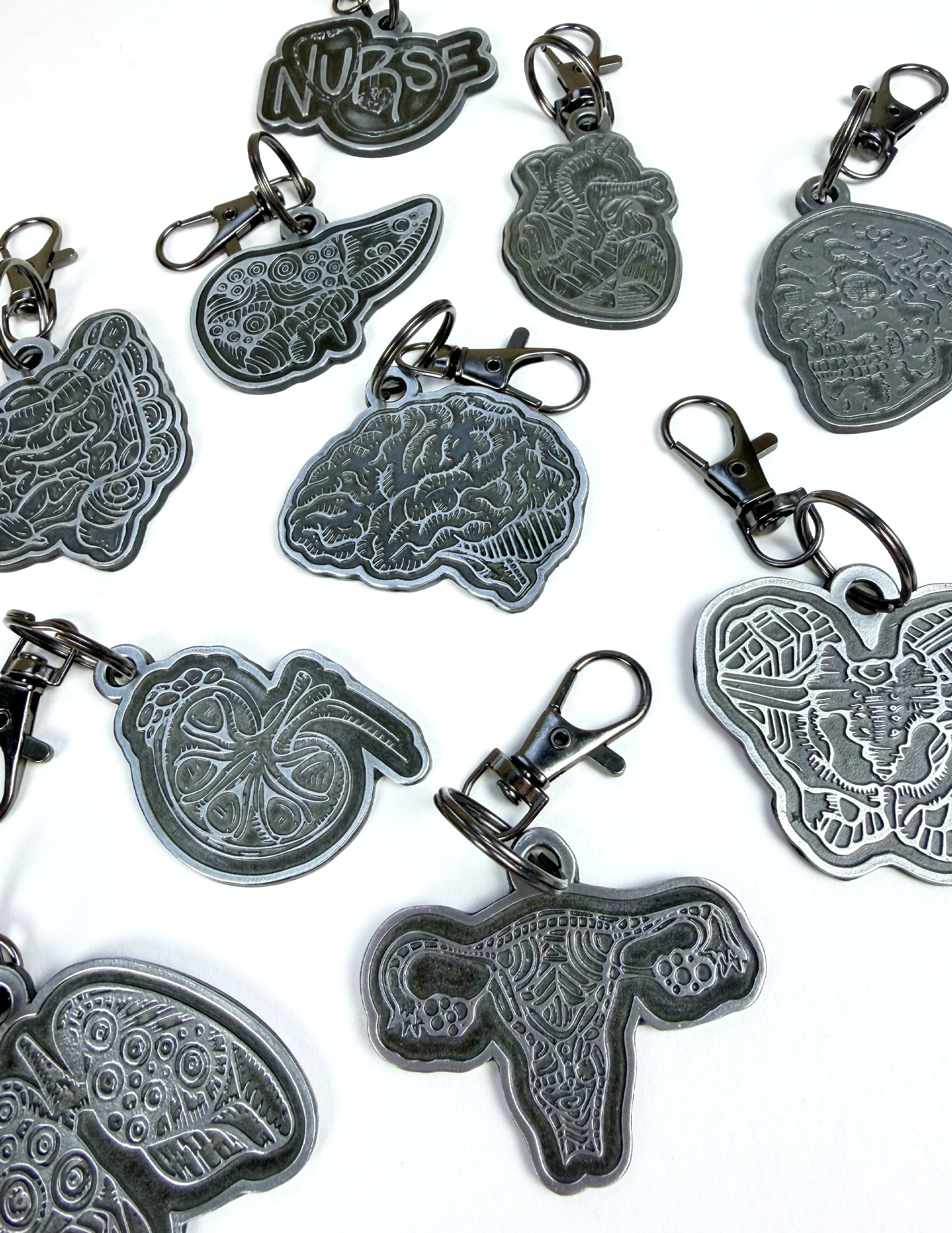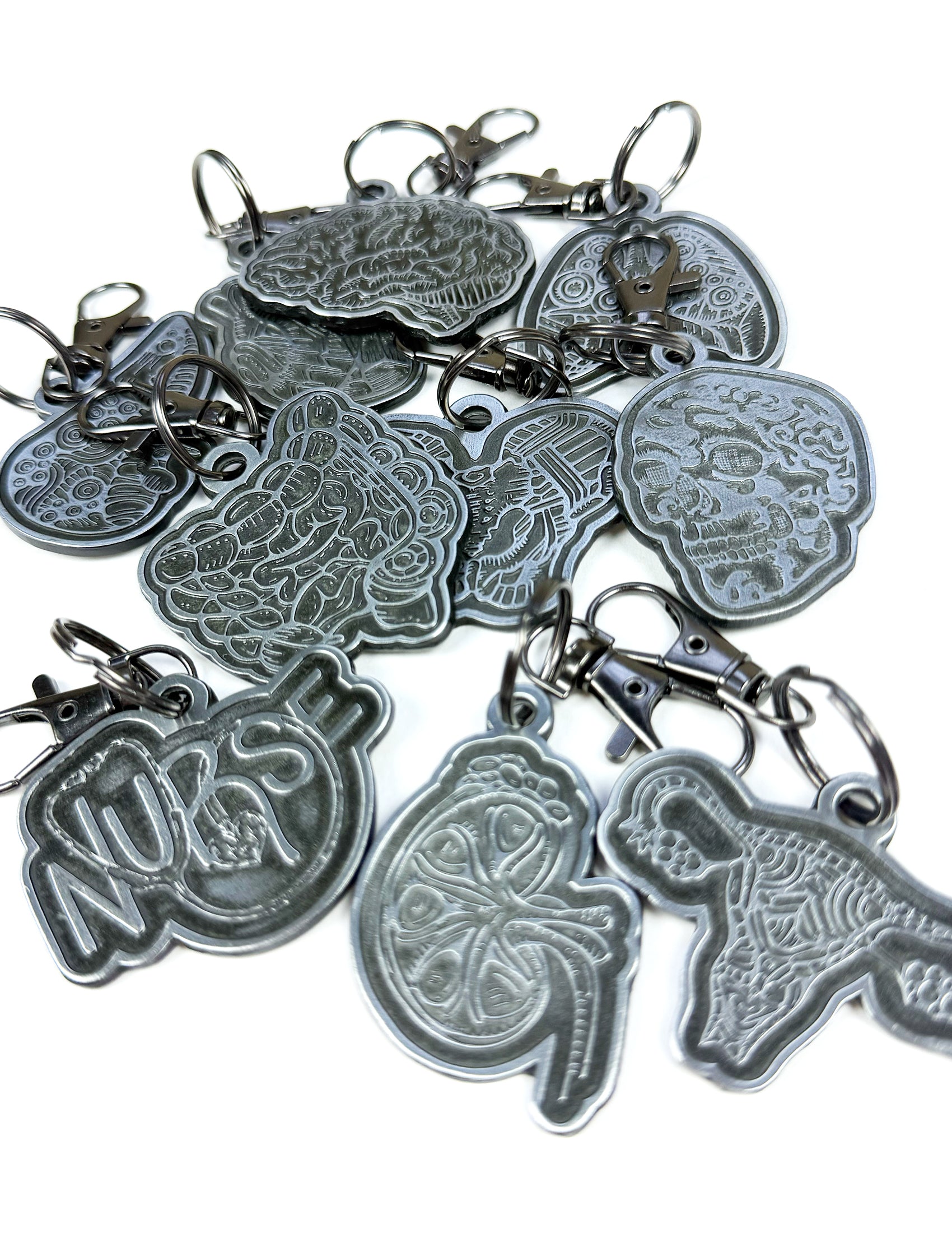 All keychains are hand-cast in Elkhorn, Wisconsin, using a premium zinc alloy. This material is chosen for its excellent strength, fine detail reproduction, and beautiful finish. The zinc alloy is non-ferromagnetic, meaning it won't be attracted to MRI magnets. This makes it a safe option for medical professionals to wear!