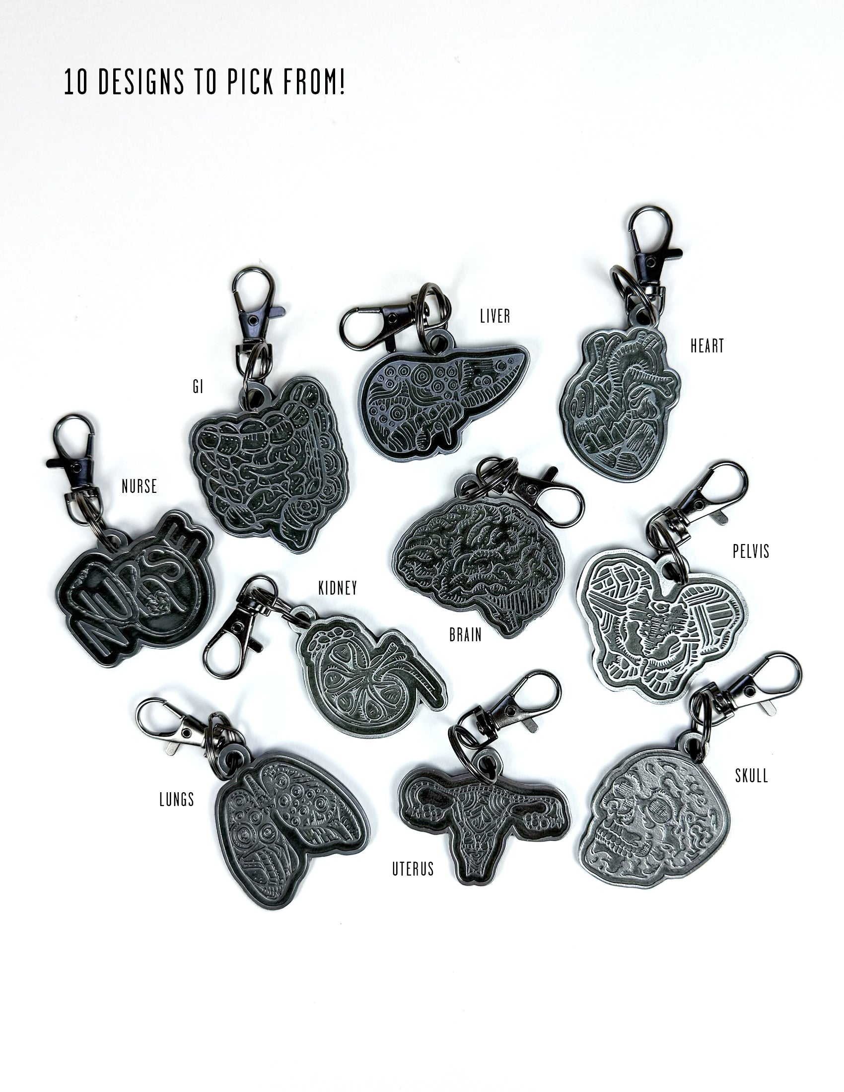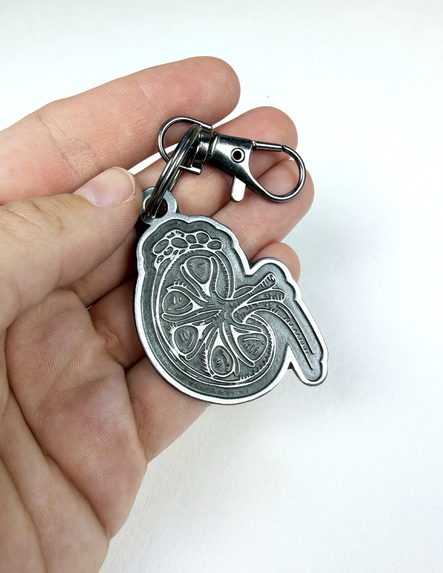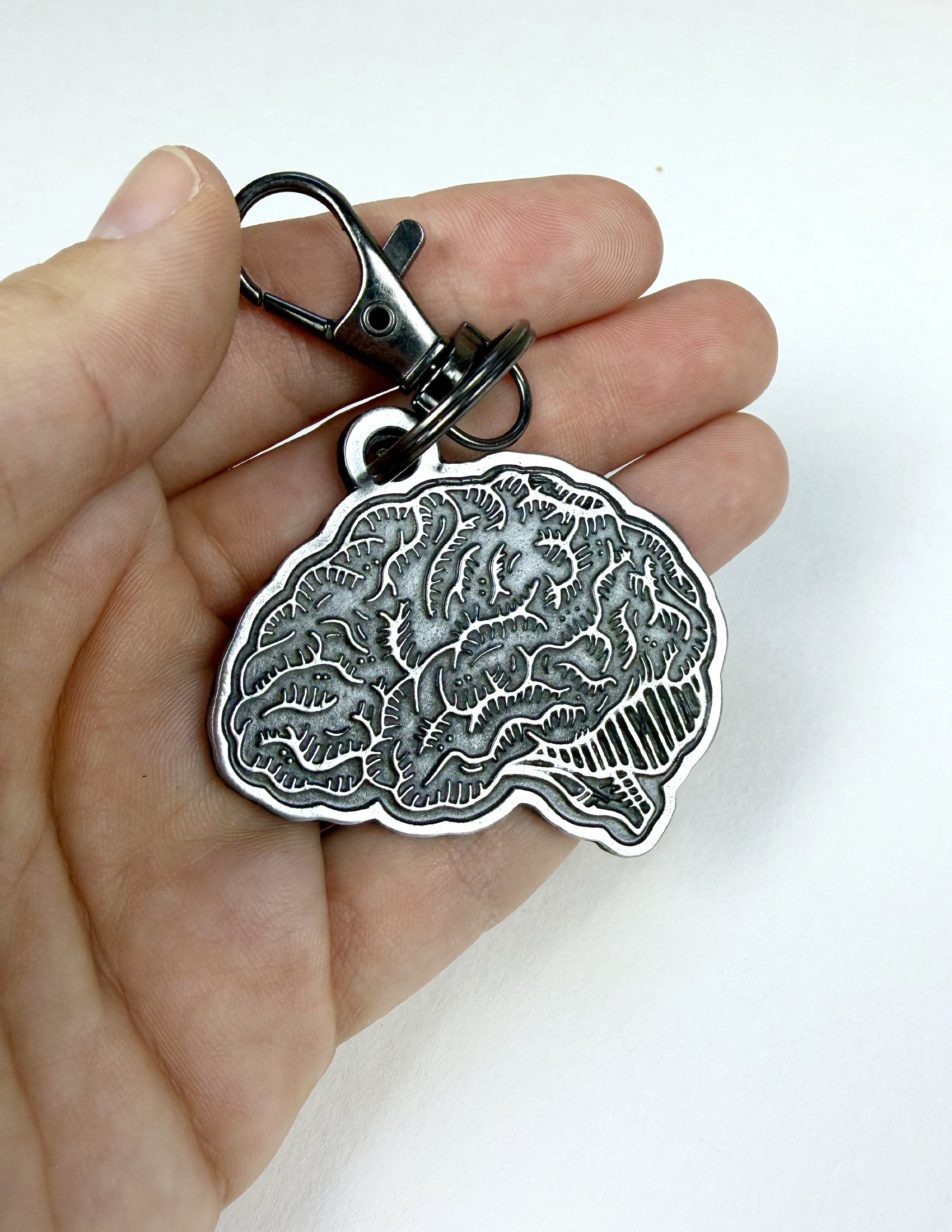 All keychains are hand-cast in Elkhorn, Wisconsin, using a premium zinc alloy. This material is chosen for its excellent strength, fine detail reproduction, and beautiful finish. The zinc alloy is non-ferromagnetic, meaning it won't be attracted to MRI magnets. This makes it a safe option for medical professionals to wear!