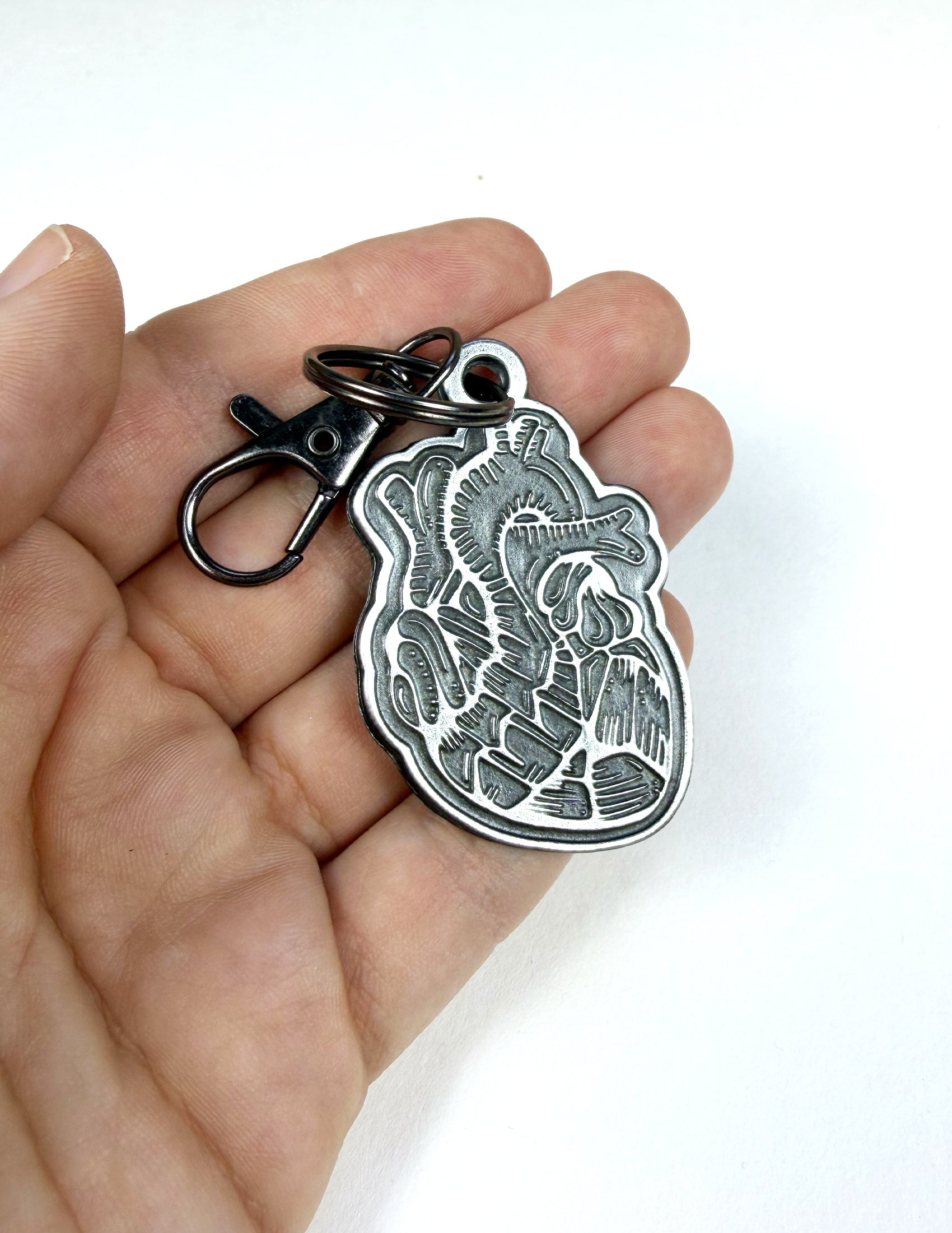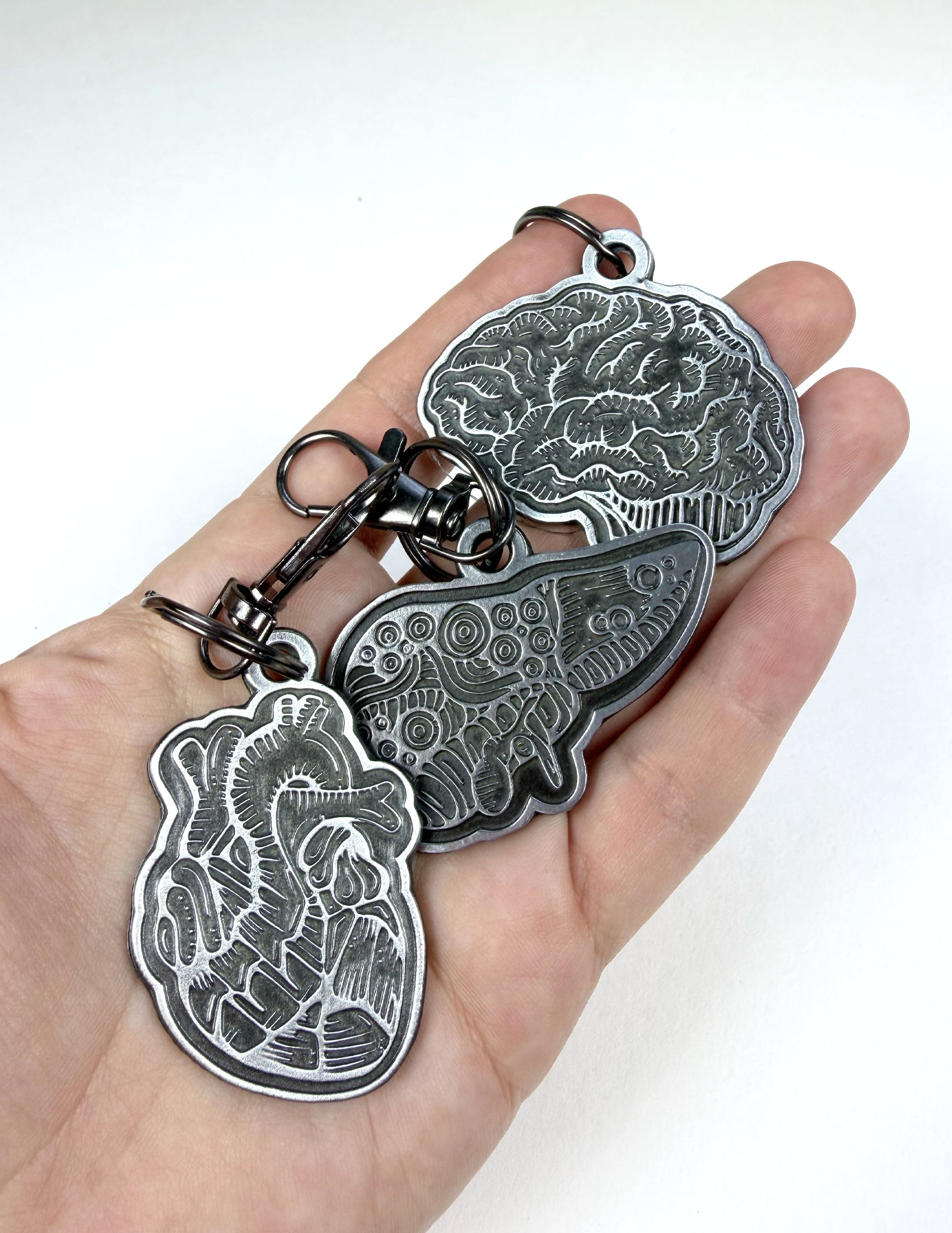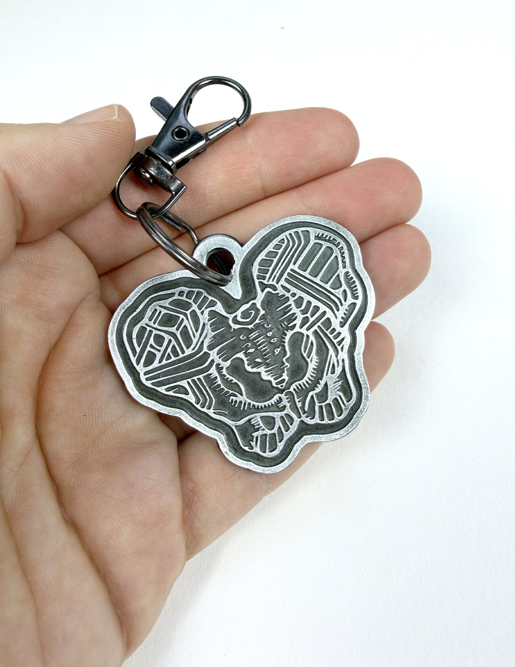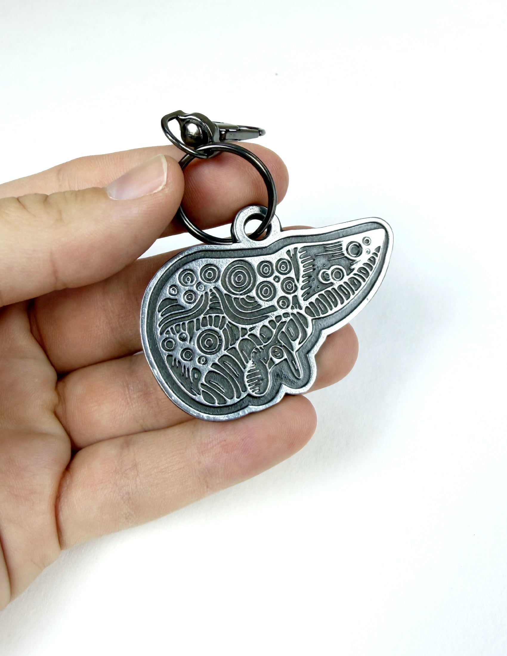 All keychains are hand-cast in Elkhorn, Wisconsin, using a premium zinc alloy. This material is chosen for its excellent strength, fine detail reproduction, and beautiful finish. The zinc alloy is non-ferromagnetic, meaning it won't be attracted to MRI magnets. This makes it a safe option for medical professionals to wear!