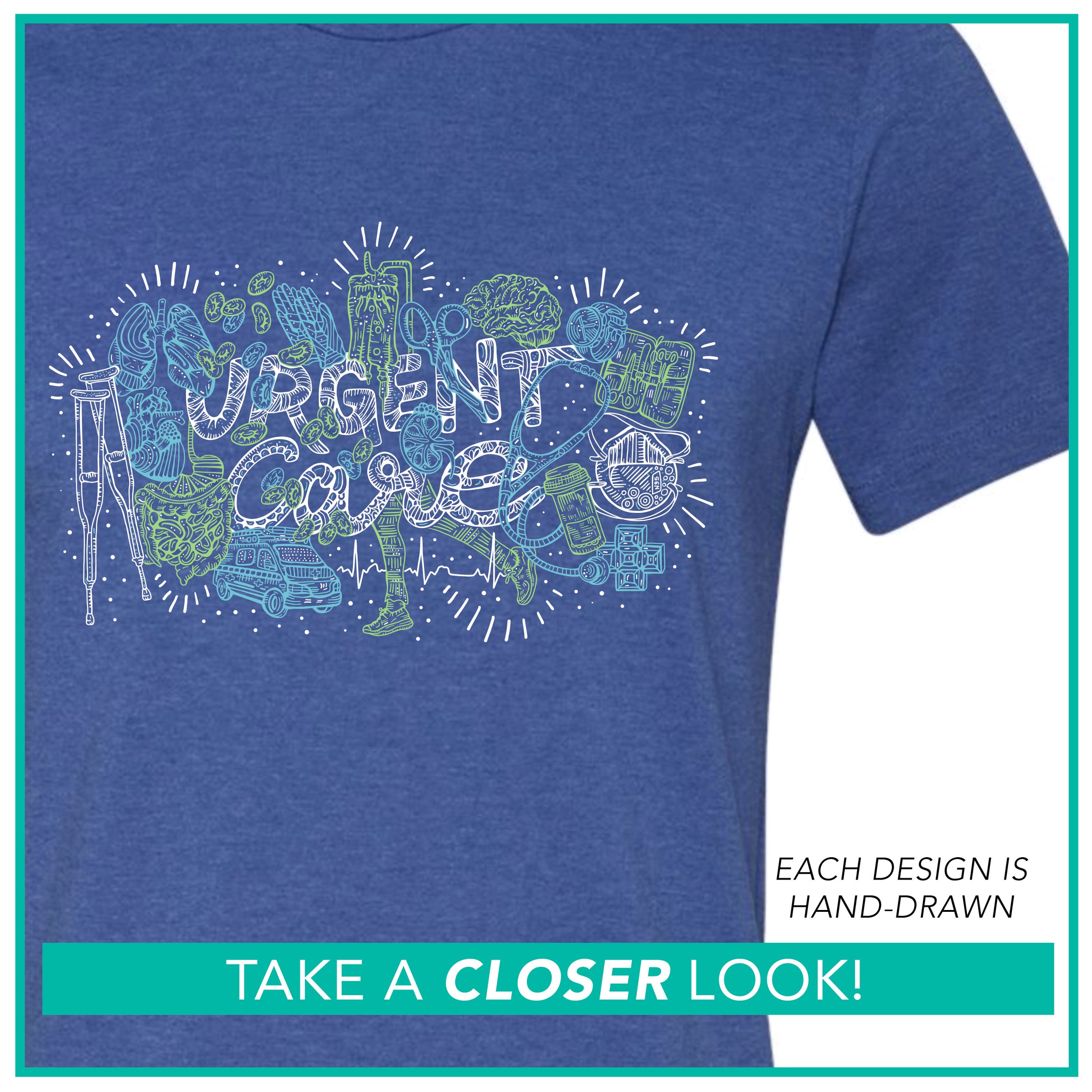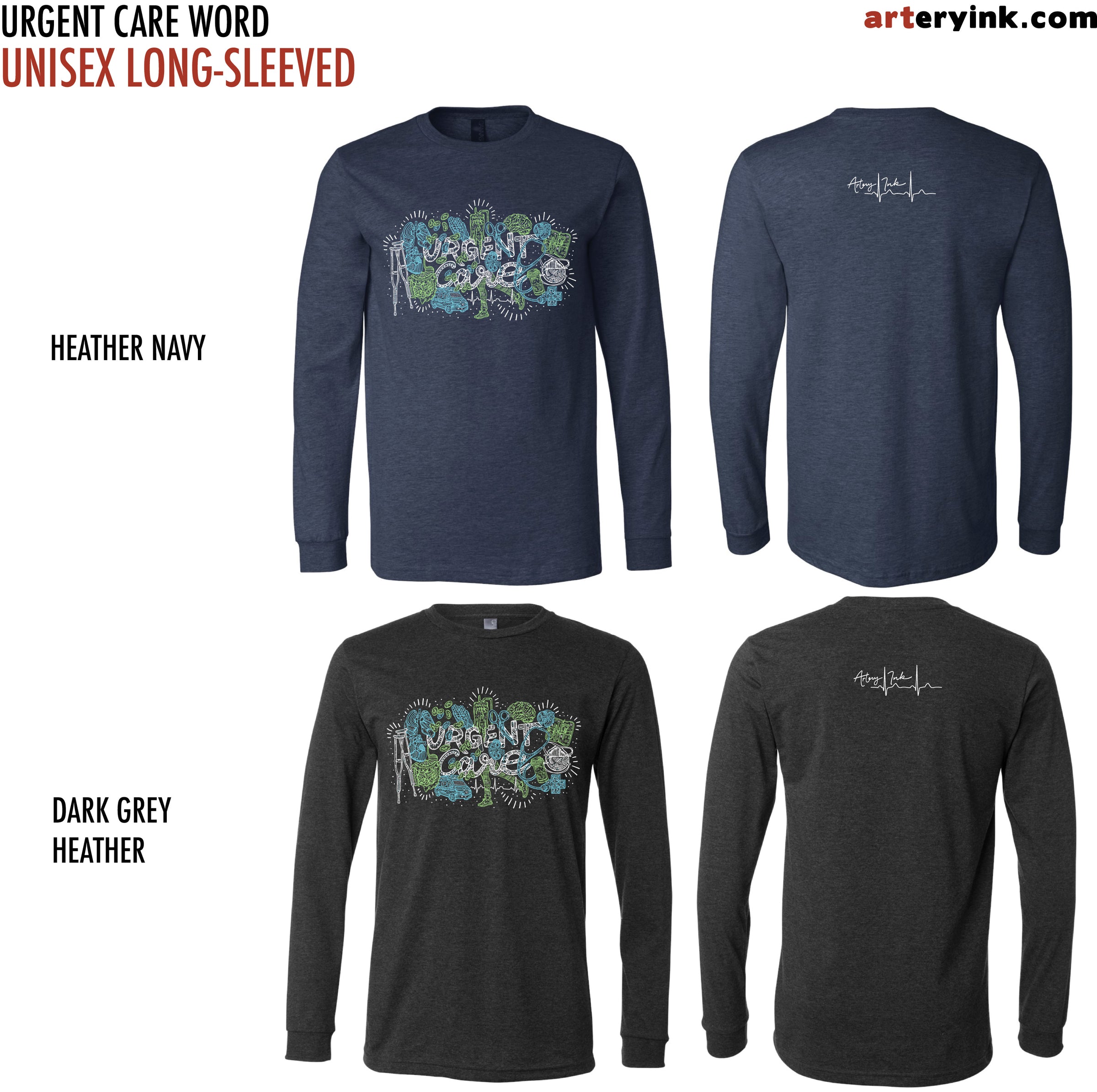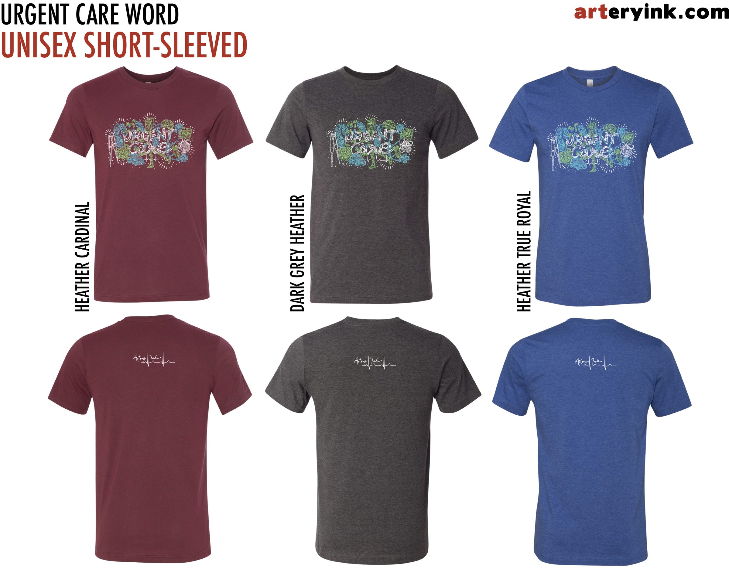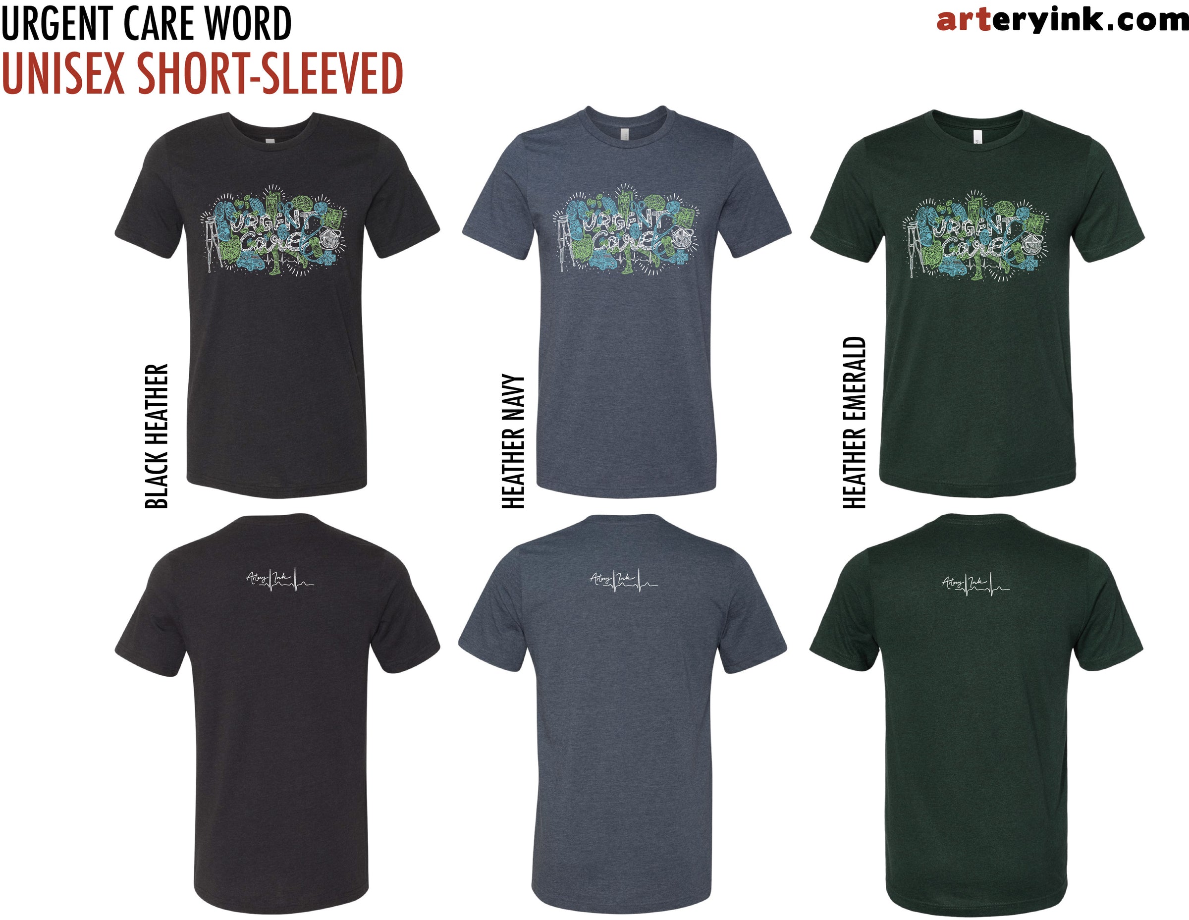 FRONT: "Urgent Care" Word Design (printed in white, blue & green)